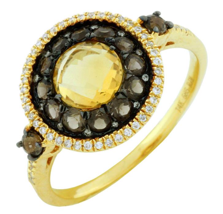 1.91CT DIAMOND & AAA CITRINE & SMOKY TOPAZ 14K YELLOW GOLD ROUND FLOWER FUN RING