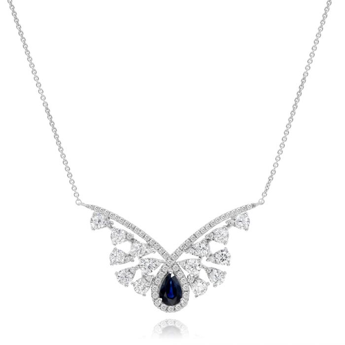14KT WHITEGOLD NECKLACE. 3D FLOWER V SHAPEDESIGN. ROUND DIAMONDS ARE F/G COLOR, VSSI CLARITY 1.47CARATS. AAA PEAR SHAPE SAPPHIRE IS .44 CARATS.17" INCHES LONG. WRITTEN APPRAISAL AVAILABLE. COMES IN A PRESENTABLE GIFT BOX.