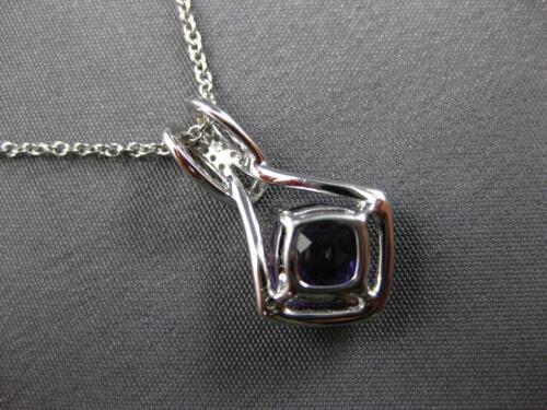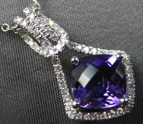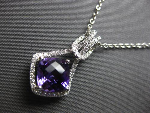 14KT WHITE GOLD FLOATING PENDANT. 3D GEOMETRICAL LOVE KNOT TEAR DROP DESIGN. ROUND DIAMONDS ARE F/G COLOR, VSSI CLARITY .22 CARATS. AAA EXTRA FACETED CUSHION CUT AMETHYST IS 1.70 CARATS. MEASURES 18mm X 11.5mm. COMES ON A 14KT GOLD DIAMOND CUT 18" INCH CHAIN. WRITTEN APPRAISAL AVAILABLE. COMES IN A PRESENTABLE GIFT BOX.
