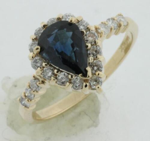 14KT YELLOW GOLD FRIENDSHIP LOVE RING. 3D CLASSIC HALO DESIGN. ROUND DIAMONDS ARE F/G COLOR, VSSI CLARITY .45 CARATS. AAA PEAR SHAPE SAPPHIRE IS 1.47 CARATS. RING SIZE 7. CAN BE SIZED BY OUR MASTER JEWELER UPON REQUEST. WRITTEN APPRAISAL AVAILABLE. COMES IN A PRESENTABLE GIFT BOX.