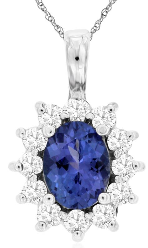 14KT WHITE GOLD FLOATING PENDANT. 3D CLASSIC FLOWER DESIGN. ROUND DIAMONDS ARE F/G COLOR, VSSI CLARITY 63 CARATS. AAA EXTRA FACETED OVAL TANZANITE IS 1.30 CARATS. COMES ON A 14KT GOLD DIAMOND CUT 18" INCH CHAIN. WRITTEN APPRAISAL AVAILABLE. COMES IN A PRESENTABLE GIFT BOX.