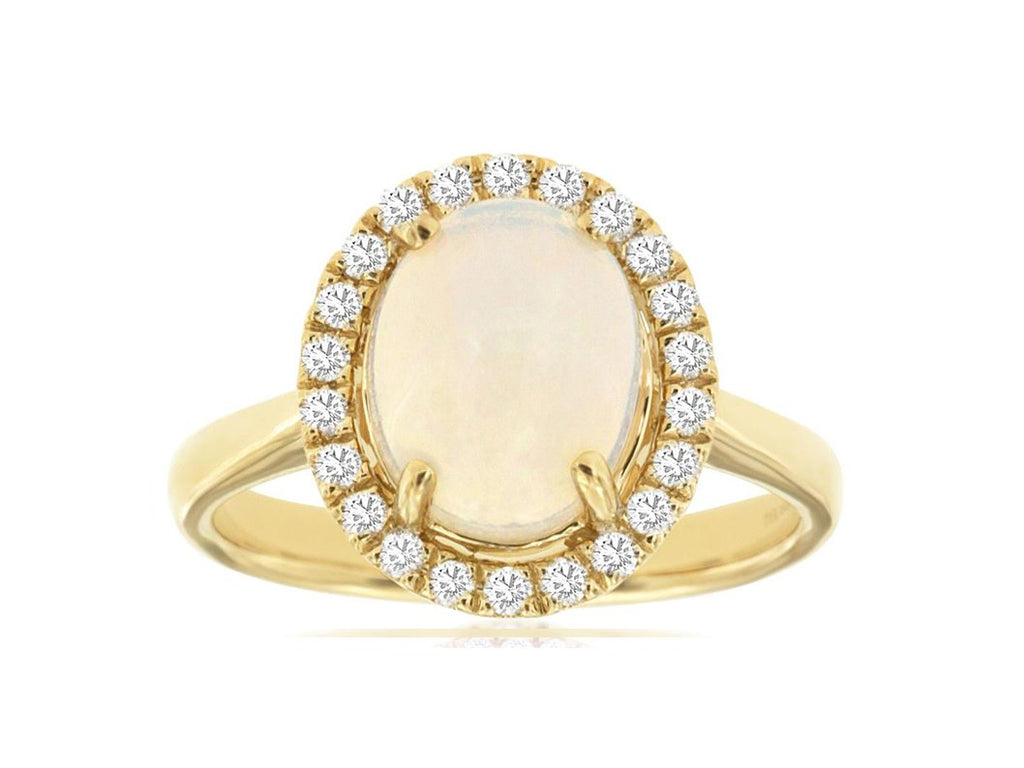 14KT YELLOW GOLD FUN RING. 3D HALO FLOWER DESIGN. ROUND DIAMONDS ARE F/G COLOR, VSSI CLARITY .25 CARATS. AAA OVAL OPAL IS 1.70 CARATS. RING SIZE 7. CAN BE SIZED BY OUR MASTER JEWELER UPON REQUEST. WRITTEN APPRAISAL AVAILABLE. COMES IN A PRESENTABLE GIFT BOX.