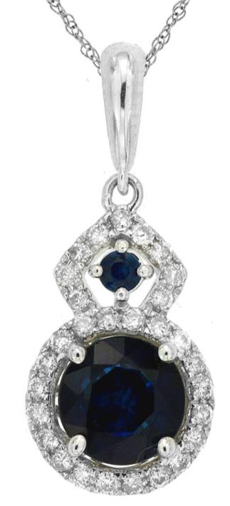 14KT WHITE GOLD FLOATING PENDANT. 3D CLASSIC HALO DESIGN. ROUND DIAMONDS ARE F/G COLOR, VSSI CLARITY .26 CARATS. AAA EXTRA FACETED ROUND SAPPHIRES ARE 1.70 CARATS (SIGN OF HEAT AND DIFFUSION). COMES ON A 14KT GOLD DIAMOND CUT 18" INCH CHAIN. WRITTEN APPRAISAL AVAILABLE. COMES IN A PRESENTABLE GIFT BOX.