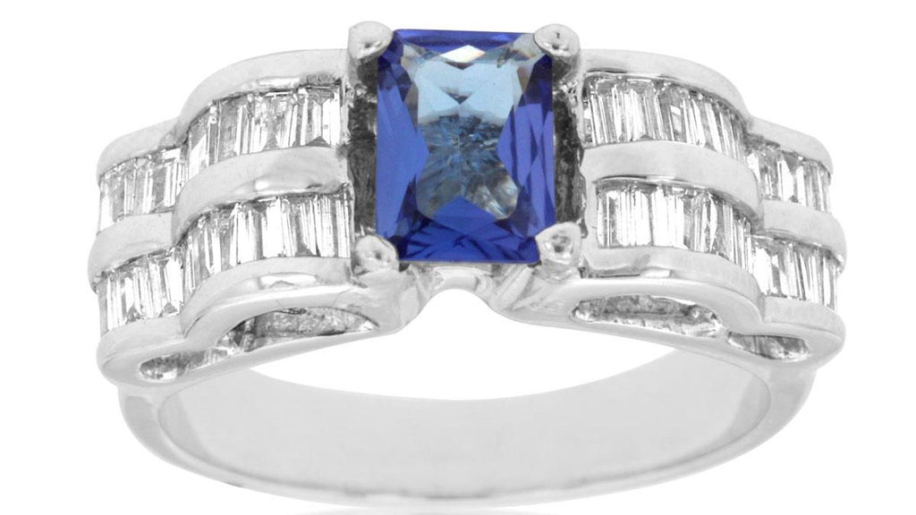 14KT WHITE GOLD ENGAGEMENT RING. 3D DESIGN. BAGUETTE DIAMONDS ARE F/G COLOR, VSSI CLARITY .96 CARATS. AAA EMERALD CUT TANZANITE IS 1.0 CARAT. CAN BE SIZED BY OUR MASTER JEWELER UPON REQUEST. WRITTEN APPRAISAL AVAILABLE. COMES IN A PRESENTABLE GIFT BOX.
