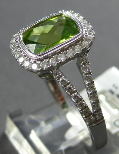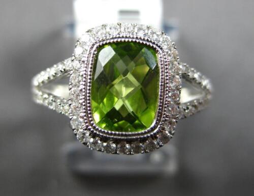 14KT WHITE GOLD ENGAGEMENT RING. 3D SQUARE CLASSIC HALO DESIGN. ROUND DIAMONDS ARE F/G COLOR, VSSI CLARITY .37 CARATS. AAA EXTRA FACETED CUSHION CUT PERIDOT IS 1.6 CARATS. MEASURES 11.5mm WIDE. RING SIZE 7. CAN BE SIZED BY OUR MASTER JEWELER UPON REQUEST. WRITTEN APPRAISAL AVAILABLE. COMES IN A PRESENTABLE GIFT BOX.