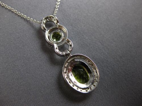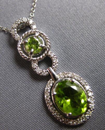 14KT WHITE GOLD FUN FLOATING PENDANT. 3D LOVE KNOT HALO DESIGN. ROUND DIAMONDS ARE F/G COLOR, VSSI CLARITY .17 CARATS. AAA EXTRA FACETED OVAL PERIDOTS ARE 1.80 CARATS. MEASURES 28.5mm X 10.5mm. COMES ON A 14KT GOLD DIAMOND CUT 16" INCH CHAIN. WRITTEN APPRAISAL AVAILABLE. COMES IN A PRESENTABLE GIFT BOX.