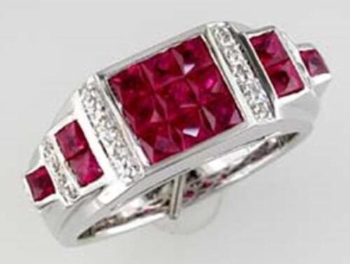 14KT WHITE GOLD LOVE RING. 3D CLASSIC INVISIBLE DESIGN. ROUND DIAMONDS ARE F/G COLOR, VSSI CLARITY .11 CARATS. AAA PRINCESS CUT RUBIES ARE 1.86 CARATS. RING SIZE 7. CAN BE SIZED BY OUR MASTER JEWELER UPON REQUEST. WRITTEN APPRAISAL AVAILABLE. COMES IN A PRESENTABLE GIFT BOX.