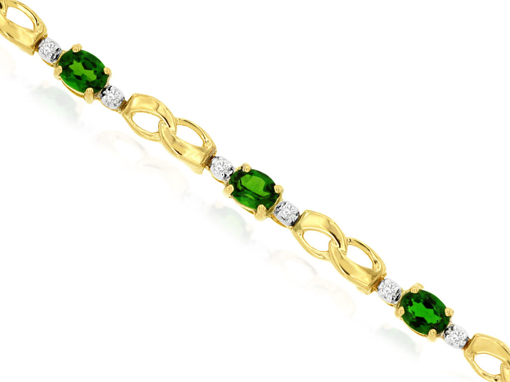 14KT YELLOW GOLD TENNIS BRACELET. 3D THREE STONE LOVE KNOT DESIGN. ROUND DIAMONDS ARE F/G COLOR, VSSI CLARITY .17 CARATS. AAA OVAL RUSSALITES ARE 1.80 CARATS. 7" INCHES LONG. WRITTEN APPRAISAL AVAILABLE. COMES IN A PRESENTABLE GIFT BOX.
