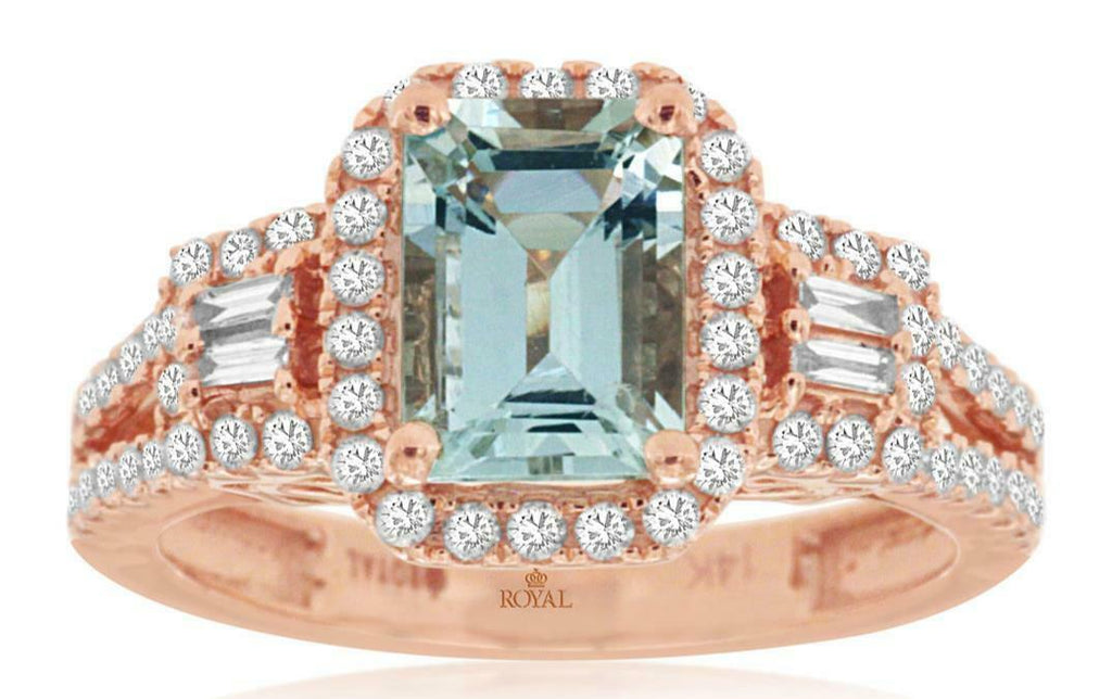 14KT ROSE GOLD ENGAGEMENT RING. 3D HALO OCTAGON DESIGN. ROUND AND BAGUETTE DIAMONDS ARE F/G COLOR, VSSI CLARITY .58 CARATS. AAA EMERALD CUT AQUAMARINE IS 1.40 CARATS. RING SIZE 7. CAN BE SIZED BY OUR MASTER JEWELER UPON REQUEST. WRITTEN APPRAISAL AVAILABLE. COMES IN A PRESENTABLE GIFT BOX.