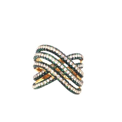 1.99CT DIAMOND & AAA EMERALD 18K YELLOW GOLD MULTI ROW CRISS CROSS INFINITY RING