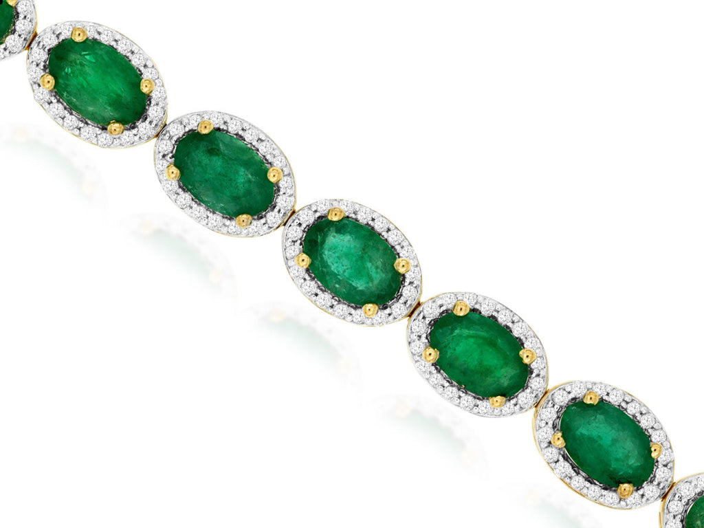10.40CT DIAMOND & AAA EMERALD 14KT YELLOW GOLD OVAL & ROUND HALO TENNIS BRACELET