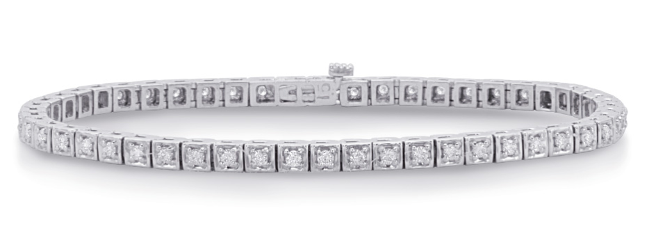 14KT WHITE GOLD TENNIS BRACELET. 3D SQUARE ETERNITY FILIGREE DESIGN. ROUND DIAMONDS ARE F/G COLOR, VSSI CLARITY 1.02 CARATS. 7" INCHES LONG. WRITTEN APPRAISAL AVAILABLE. COMES IN A PRESENTABLE GIFT BOX.