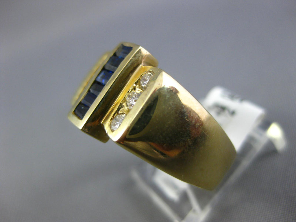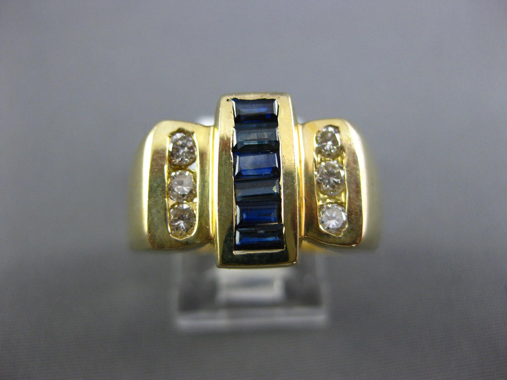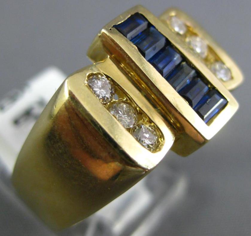14KT YELLOW GOLD FUN RING. 3D BEZEL BOW SHAPE DESIGN. ROUND DIAMONDS ARE F/G COLOR, VSSI CLARITY .30 CARATS. AAA BAGUETTE SAPPHIRES ARE .72 CARATS. MEASURES 12mm WIDE. RING SIZE 9. CAN BE SIZED BY OUR MASTER JEWELER UPON REQUEST. WRITTEN APPRAISAL AVAILABLE. COMES IN A PRESENTABLE GIFT BOX.