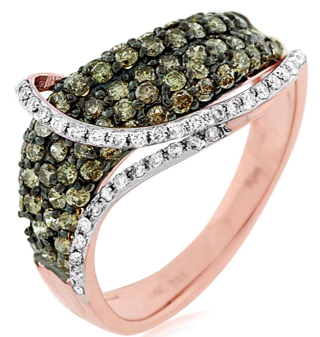 14KT ROSE GOLD FUN RING. 3D MULTI ROW LOVE KNOT DESIGN. WHITE DIAMONDS ARE F/G COLOR, VSSI CLARITY .15 CARATS. CHOCOLATE FANCY DIAMONDS ARE .87 CARATS. RING SIZE 7. CAN BE SIZED BY OUR MASTER JEWELER UPON REQUEST. WRITTEN APPRAISAL AVAILABLE. COMES IN A PRESENTABLE GIFT BOX.