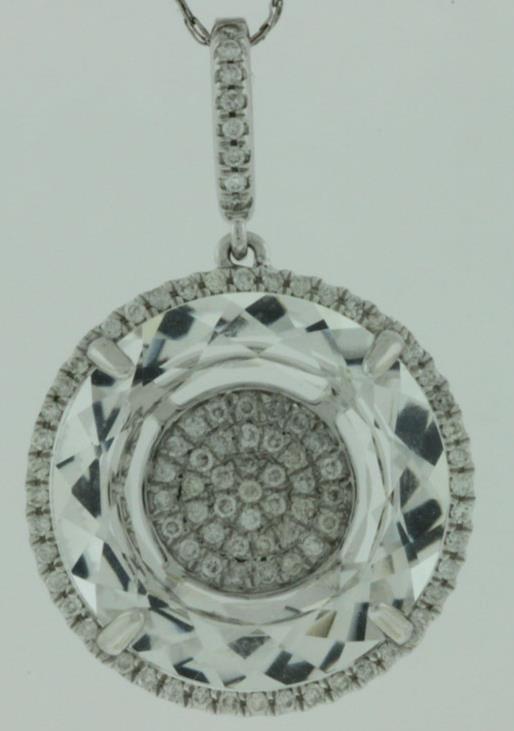 14KT WHITE GOLD FUN FLOATING PENDANT. 3D CIRCULAR DESIGN. DIAMONDS ARE F/G COLOR, VSSI CLARITY .36 CARATS. AAA WHITE TOPAZ IS 10.20 CARATS. COMES ON A 14KT GOLD DIAMOND CUT 18" INCH CHAIN. WRITTEN APPRAISAL AVAILABLE. COMES IN A PRESENTABLE GIFT BOX.