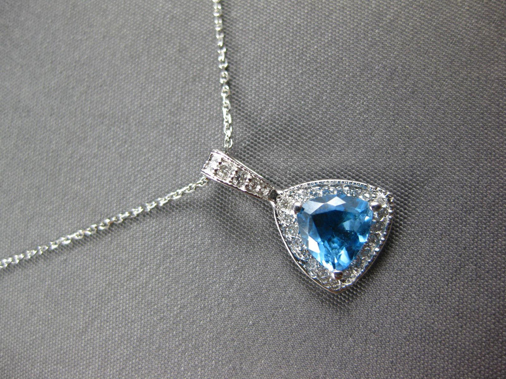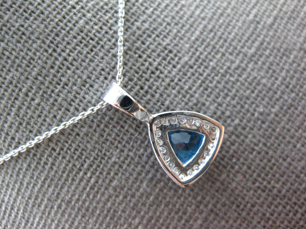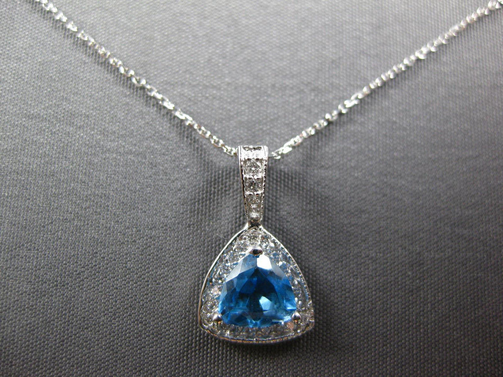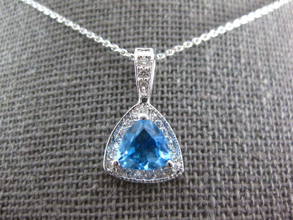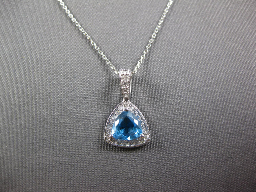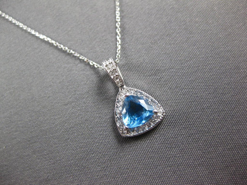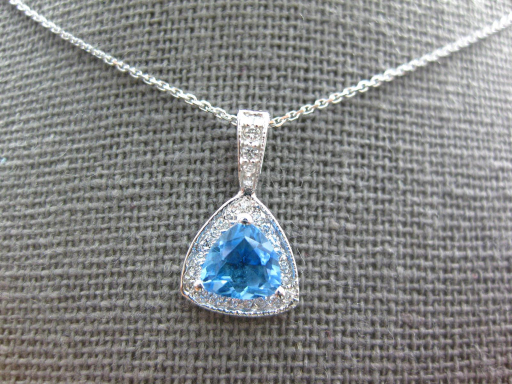 14KT WHITE GOLD FLOATING PENDANT. 3D CLASSIC HALO DESIGN. ROUND DIAMONDS ARE F/G COLOR, VSSI CLARITY .15 CARATS. AAA EXTRA FACETED TRILLION CUT BLUE TOPAZ IS .90 CARATS. MEASURES 16.5mm X 9.5mm. COMES ON A 14KT GOLD DIAMOND CUT 16" INCH CHAIN. WRITTEN APPRAISAL AVAILABLE. COMES IN A PRESENTABLE GIFT BOX.