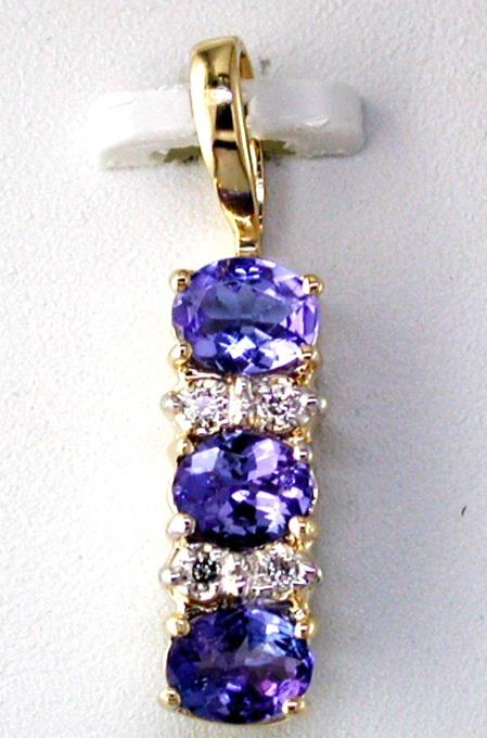 14KT YELLOW GOLD PENDANT. 3D THREE STONE PAST PRESENT FUTURE DESIGN. ROUND DIAMONDS ARE F/G COLOR, VSSI CLARITY .06 CARATS. AAA OVAL TANZANITES ARE 1.0 CARAT. COMES ON A 14KT GOLD DIAMOND CUT 18" INCH CHAIN. WRITTEN APPRAISAL AVAILABLE. COMES IN A PRESENTABLE GIFT BOX.