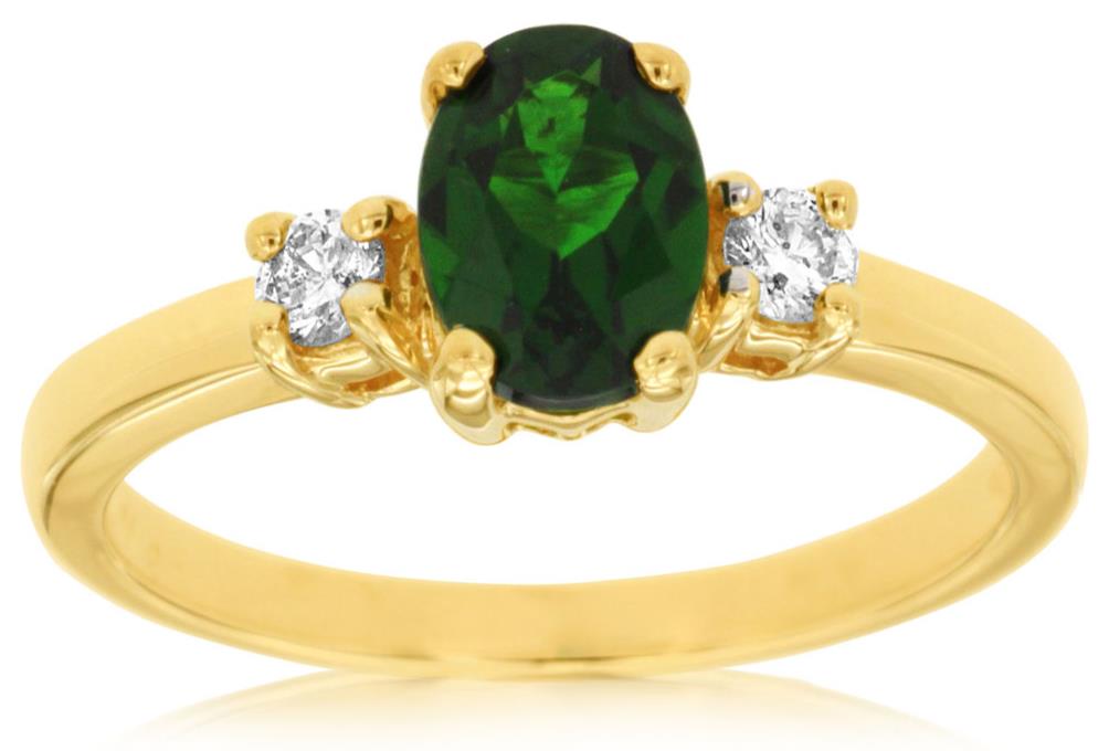 14KT YELLOW GOLD FRIENDSHIP RING. 3D THREE STONE CLASSIC DESIGN. ROUND DIAMONDS ARE F/G COLOR, VSSI CLARITY .12 CARATS. AAA OVAL RUSSALITE IS .95 CARATS. RING SIZE 7. CAN BE SIZED BY OUR MASTER JEWELER UPON REQUEST. WRITTEN APPRAISAL AVAILABLE. COMES IN A PRESENTABLE GIFT BOX.