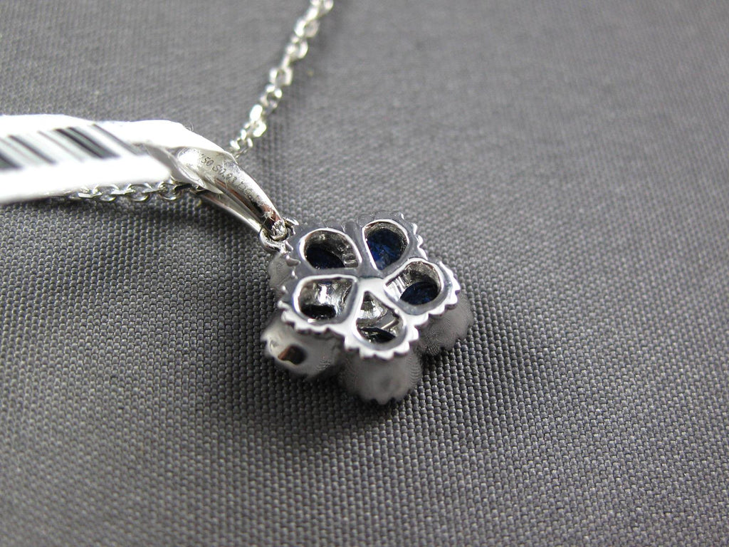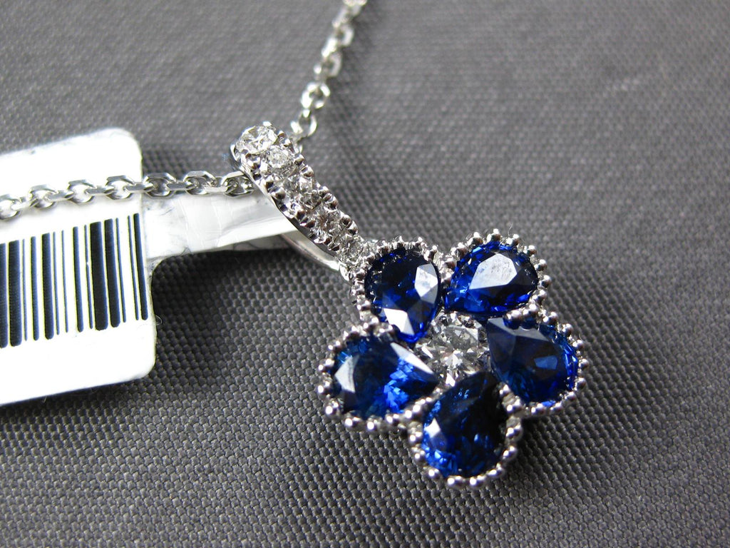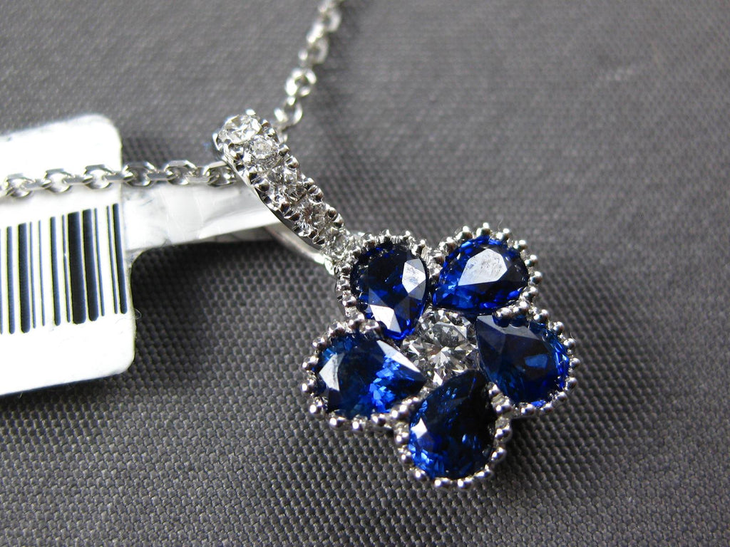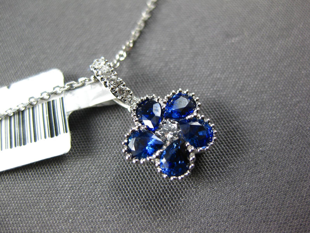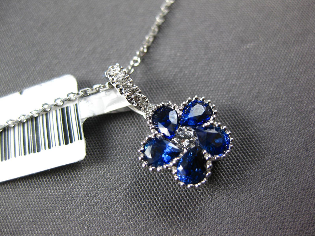 18KT WHITE GOLD FLOATING PENDANT. 3D INVISIBLE FLOWER FILIGREE DESIGN. ROUND DIAMONDS ARE F/G COLOR, VSSI CLARITY .14 CARATS. AAA PEAR SHAPE SAPPHIRES ARE .93 CARATS. MEASURES 16mm X 9mm. COMES ON A 14KT GOLD DIAMOND CUT 16" INCH CHAIN. WRITTEN APPRAISAL AVAILABLE. COMES IN A PRESENTABLE GIFT BOX.