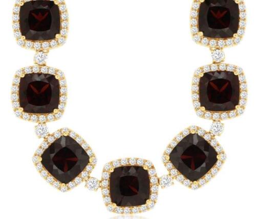 14KT YELLOW GOLD LOVE NECKLACE. 3D SQUARE HALO DESIGN. ROUND DIAMONDS ARE F/G COLOR, VSSI CLARITY 12.5 CARATS. AAA EXTRA FACETED CUSHION CUT GARNETS ARE 97 CARATS. 17" INCHES LONG. WRITTEN APPRAISAL AVAILABLE. COMES IN A PRESENTABLE GIFT BOX.