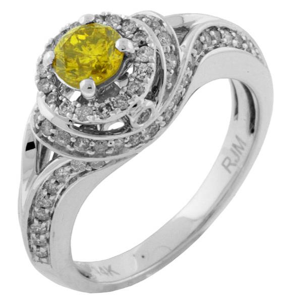 14KT WHITE GOLD ENGAGEMENT RING. 3D CLASSIC HALO DESIGN. WHITE DIAMONDS ARE F/G COLOR, VSSI CLARITY .50 CARATS. ROUND FANCY YELLOW DIAMOND IS .50 CARATS. RING SIZE 7. CAN BE SIZED BY OUR MASTER JEWELER UPON REQUEST. WRITTEN APPRAISAL AVAILABLE. COMES IN A PRESENTABLE GIFT BOX.