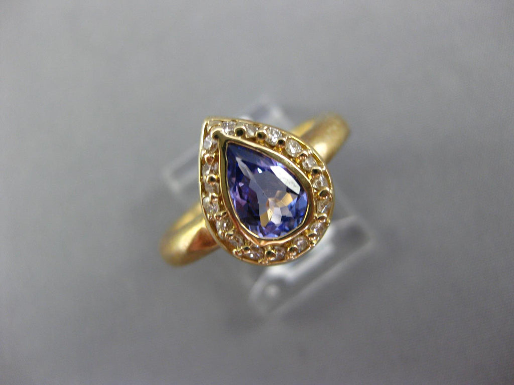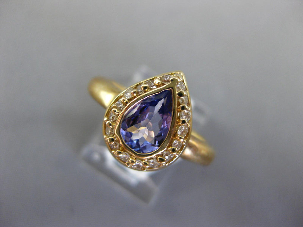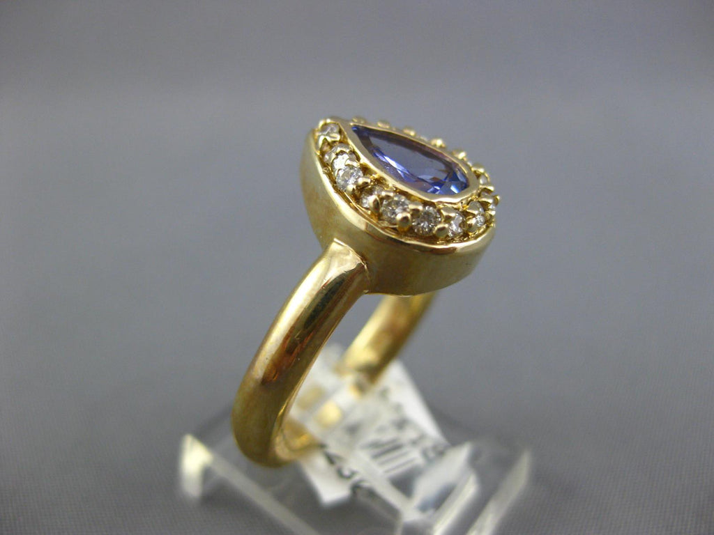 14KT YELLOW GOLD ENGAGEMENT RING. 3D BEZEL HALO DESIGN. ROUND DIAMONDS ARE F/G COLOR, VSSI CLARITY .29 CARATS. AAA PEAR SHAPE TANZANITE IS .83 CARATS. MEASURES 14mm WIDE. RING SIZE 6.75. CAN BE SIZED BY OUR MASTER JEWELER UPON REQUEST. WRITTEN APPRAISAL AVAILABLE. COMES IN A PRESENTABLE GIFT BOX.