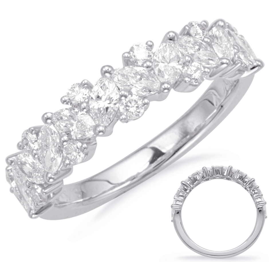 14KT WHITE GOLD ANNIVERSARY RING. 3D DIAGONAL CLASSIC SEMI ETERNITY DESIGN. DIAMONDS ARE F/G COLOR, VSSI CLARITY. MARQUISE DIAMONDS ARE .89 CARATS. ROUND DIAMONDS ARE .27 CARATS. MEASURES 5mm WIDE. RING SIZE 6. CAN BE SIZED BY OUR MASTER JEWELER UPON REQUEST. WRITTEN APPRAISAL AVAILABLE. COMES IN A PRESENTABLE GIFT BOX.