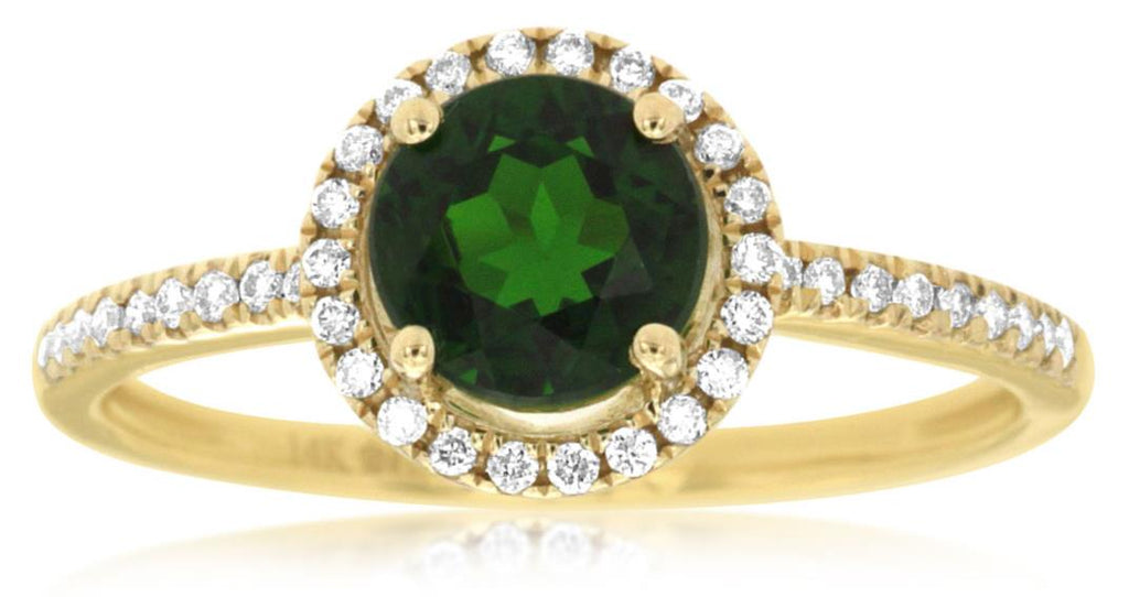 14KT YELLOW GOLD FRIENDSHIP PROMISE RING. 3D CLASSIC HALO DESIGN. DIAMONDS ARE F/G COLOR, VSSI CLARITY .16 CARATS. AAA ROUND GREEN GARNET IS 1.0 CARAT. RING SIZE 7. CAN BE SIZED BY OUR MASTER JEWELER UPON REQUEST. WRITTEN APPRAISAL AVAILABLE. COMES IN A PRESENTABLE GIFT BOX.