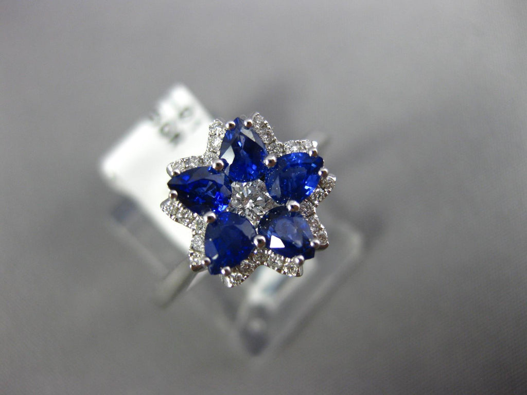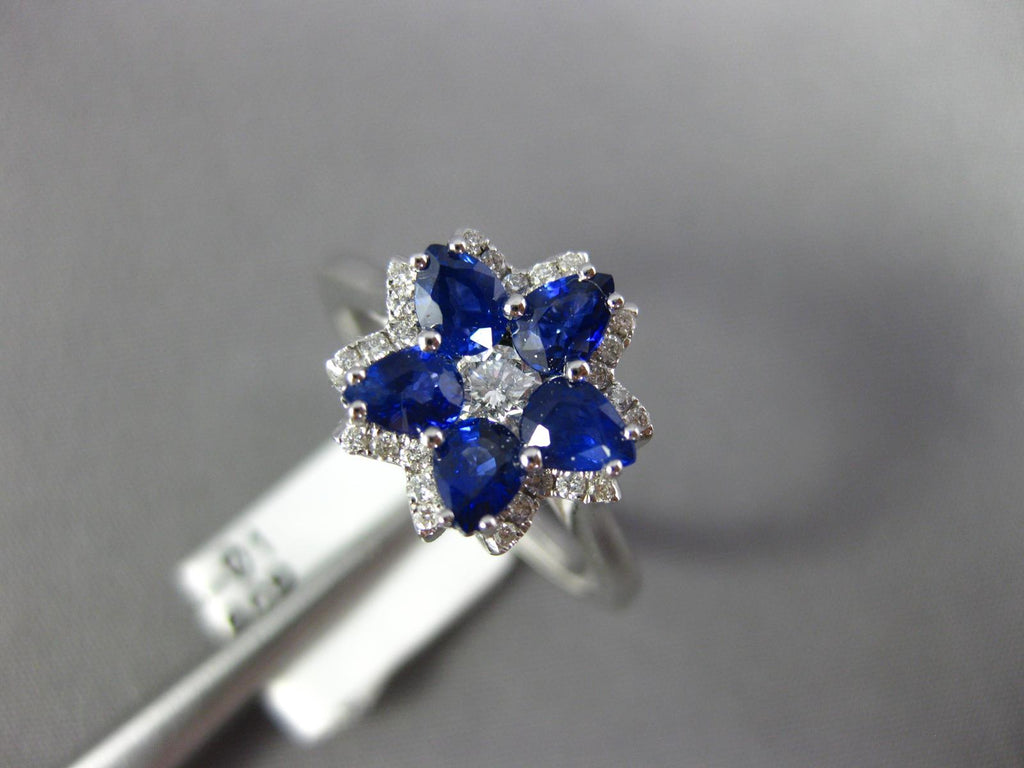 18KT WHITE GOLD FUN RING. 3D STAR FLOWER DESIGN. ROUND DIAMONDS ARE F/G COLOR, VSSI CLARITY .21 CARATS. AAA PEAR SHAPE SAPPHIRES ARE .95 CARATS. MEASURES 10mm WIDE.  RING SIZE 6.5. CAN BE SIZED BY OUR MASTER JEWELER UPON REQUEST. WRITTEN APPRAISAL AVAILABLE. COMES IN A PRESENTABLE GIFT BOX.