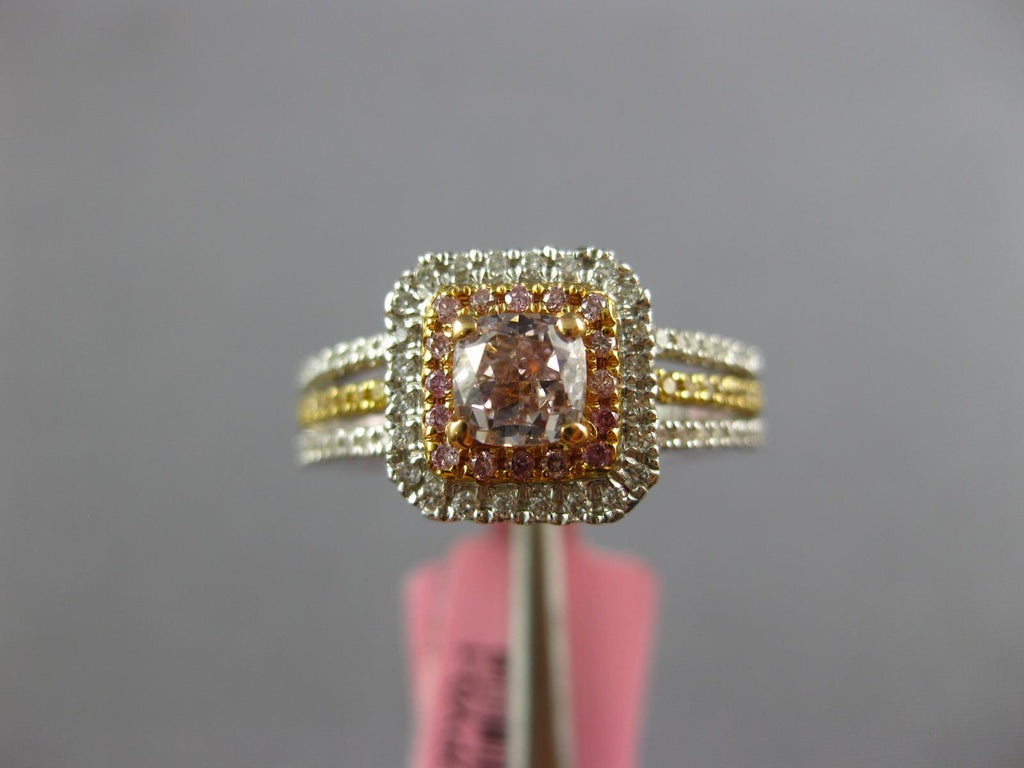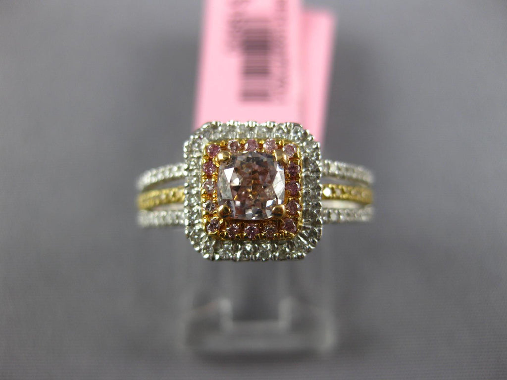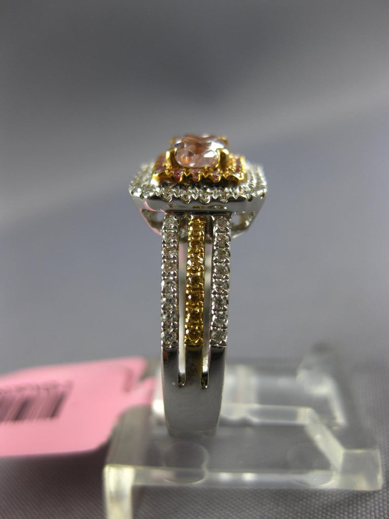 18KT WHITE, YELLOW, AND ROSE GOLD ENGAGEMENT RING. 3D ROUND DOUBLE SQUARE HALO DESIGN. WHITE DIAMONDS ARE F/G COLOR, VSSI CLARITY .23 CARATS. CENTER PINK DIAMONDS ARE .53 CARATS. CANARY DIAMONDS ARE .40 CARATS. MEASURES 9.5mm WIDE. RING SIZE 6.5. CAN BE SIZED BY OUR MASTER JEWELER UPON REQUEST. WRITTEN APPRAISAL AVAILABLE. COMES IN A PRESENTABLE GIFT BOX.