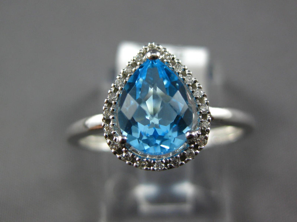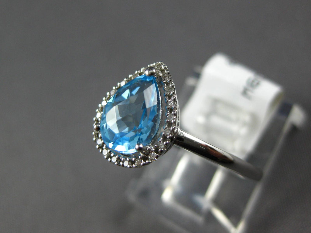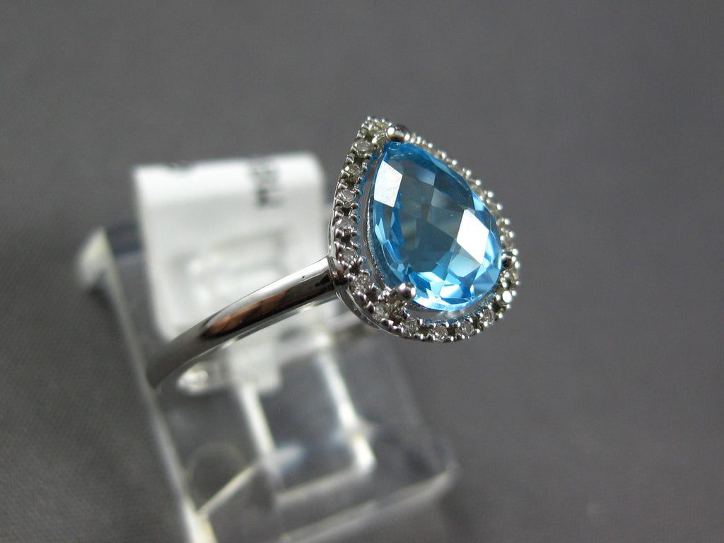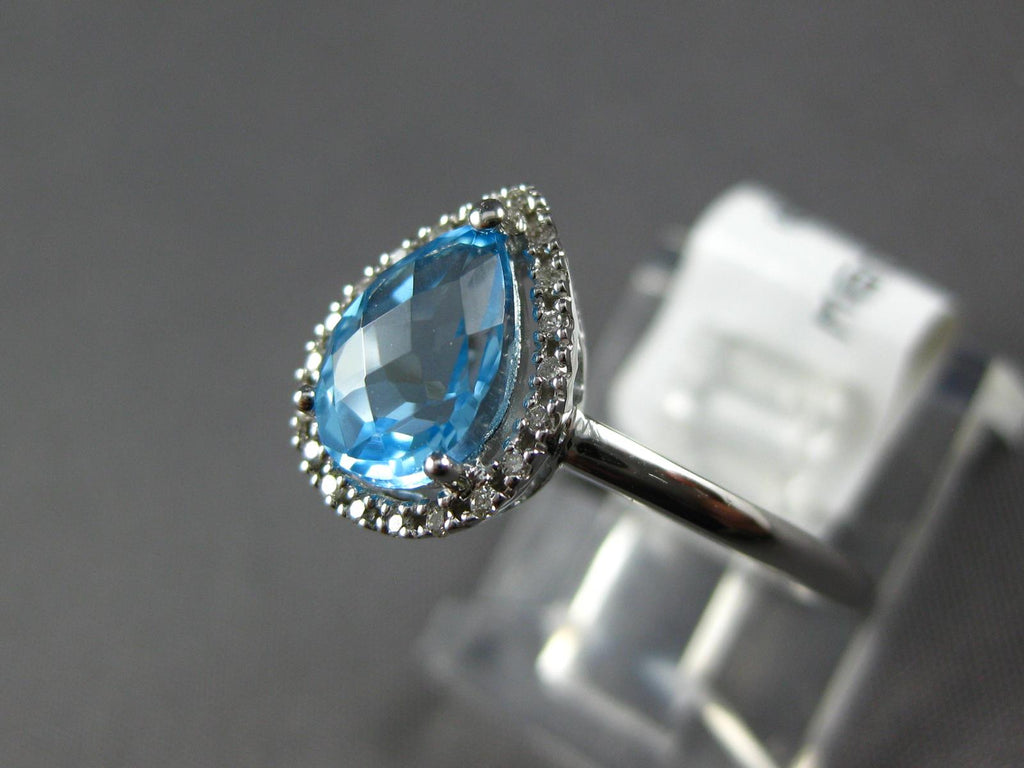 14KT WHITE GOLD LOVE RING. 3D HALO MULTI HEART DESIGN. ROUND DIAMONDS ARE F/G COLOR, VSSI CLARITY .07 CARATS. AAA EXTRA FACETED PEAR SHAPE BLUE TOPAZ IS 1.10 CARATS. MEASURES 11mm WIDE. RING SIZE 7. CAN BE SIZED BY OUR MASTER JEWELER UPON REQUEST. WRITTEN APPRAISAL AVAILABLE. COMES IN A PRESENTABLE GIFT BOX.
