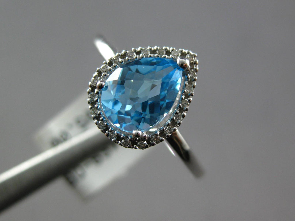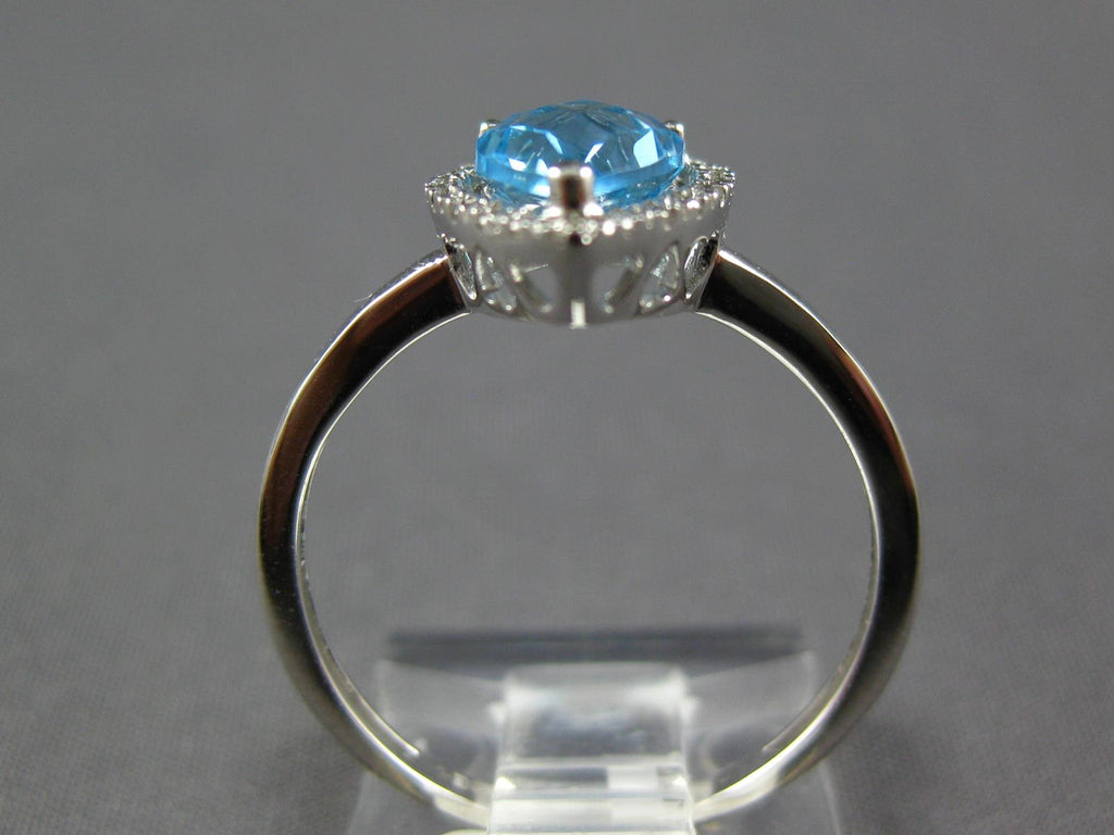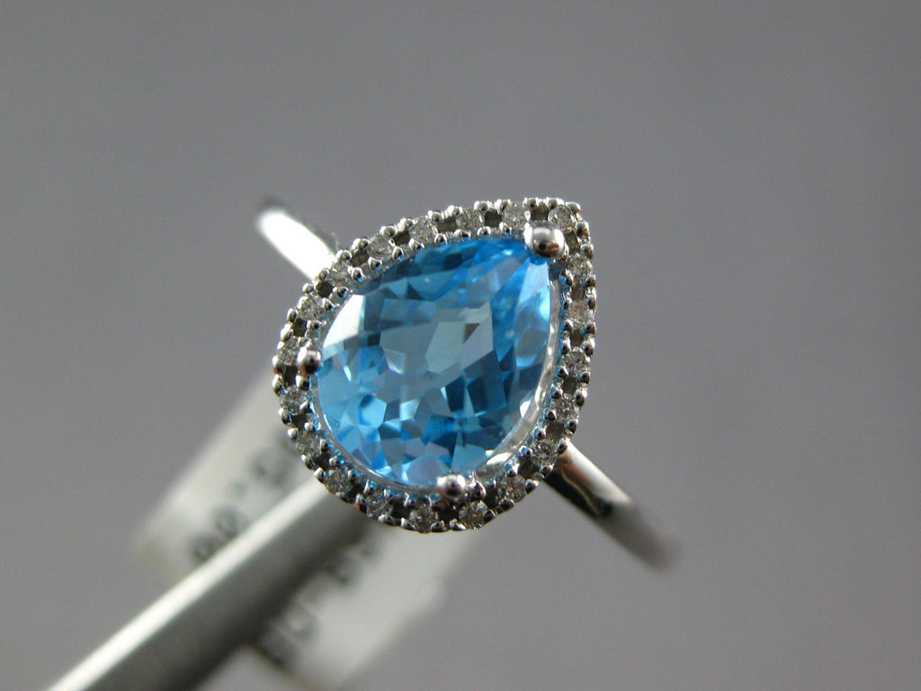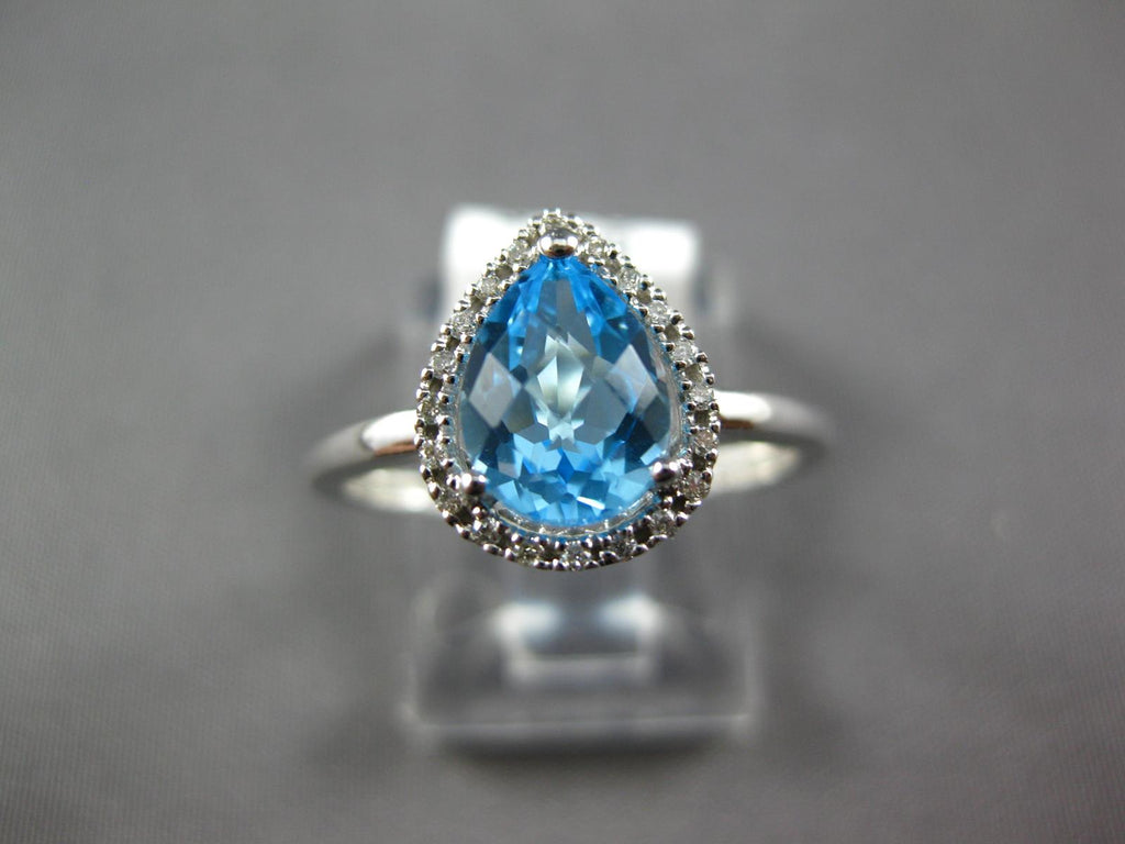14KT WHITE GOLD LOVE RING. 3D HALO MULTI HEART DESIGN. ROUND DIAMONDS ARE F/G COLOR, VSSI CLARITY .07 CARATS. AAA EXTRA FACETED PEAR SHAPE BLUE TOPAZ IS 1.10 CARATS. MEASURES 11mm WIDE. RING SIZE 7. CAN BE SIZED BY OUR MASTER JEWELER UPON REQUEST. WRITTEN APPRAISAL AVAILABLE. COMES IN A PRESENTABLE GIFT BOX.