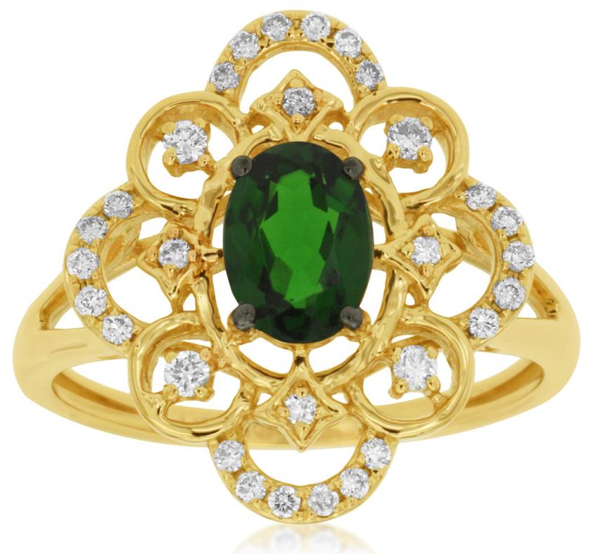 14KT YELLOW GOLD RING. 3D OPEN FILIGREE FLOWER DESIGN. ROUND DIAMONDS ARE F/G COLOR, VSSI CLARITY .22 CARATS. AAA OVAL RUSSALITE IS .95 CARATS. RING SIZE 7. CAN BE SIZED BY OUR MASTER JEWELER UPON REQUEST. WRITTEN APPRAISAL AVAILABLE. COMES IN A PRESENTABLE GIFT BOX.