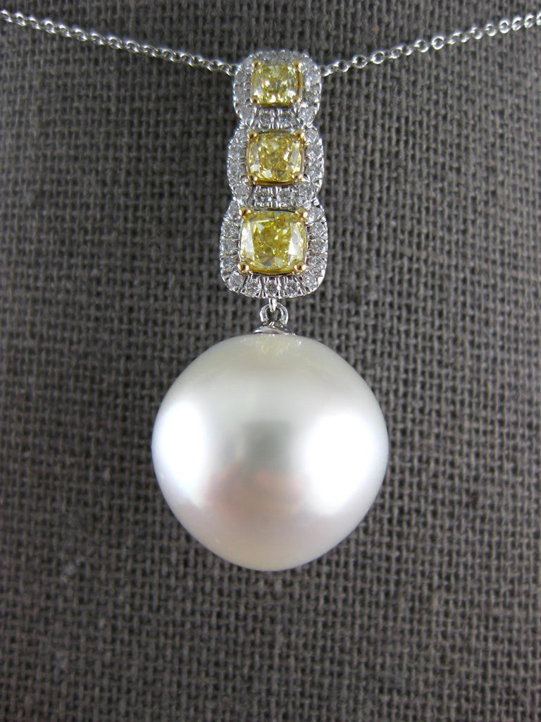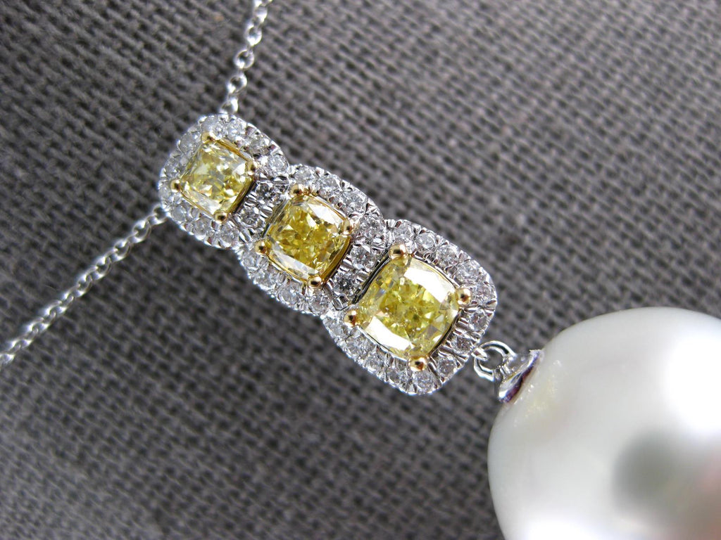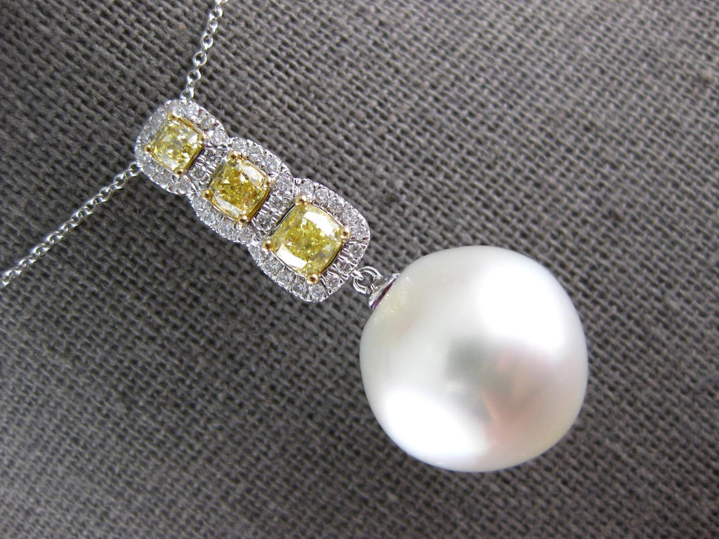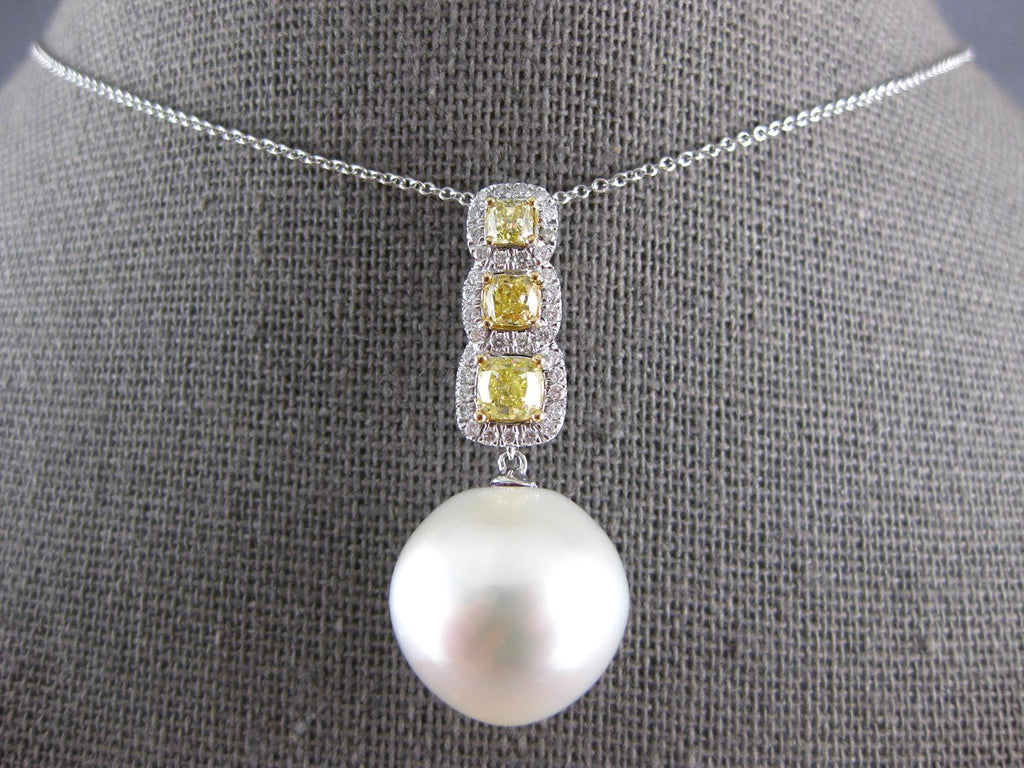 18KT WHITE GOLD FLOATING PENDANT. 3D SQUARE JOURNEY DESIGN. WHITE DIAMONDS ARE F/G COLOR, VSSI CLARITY .21 CARATS. CANARY DIAMONDS ARE .98 CARATS. FEATURES AAA SOUTH SEA PEARL. MEASURES 35mm X 15mm. COMES ON A 14KT GOLD DIAMOND CUT 18" INCH CHAIN. WRITTEN APPRAISAL AVAILABLE. COMES IN A PRESENTABLE GIFT BOX.