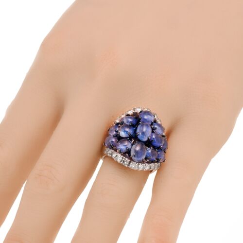 18KT WHITE GOLD FUN RING. 3D DESIGN. ROUND DIAMONDS ARE G/H COLOR, VSSI CLARITY 1.32 CARATS. AAA CABOCHON OVAL SAPPHIRES ARE 11.52 CARATS. RING SIZE 6.75. CAN BE SIZED BY OUR MASTER JEWELER UPON REQUEST. WRITTEN APPRAISAL AVAILABLE. COMES IN A PRESENTABLE GIFT BOX.