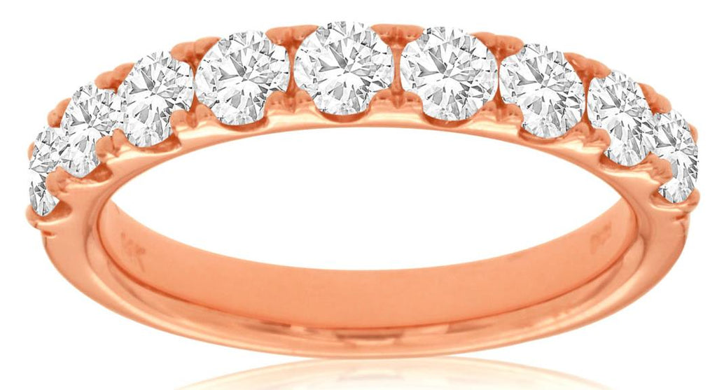 14KT ROSE GOLD ANNIVERSARY RING. 3D SHARED PRONG NINE STONE SEMI ETERNITY DESIGN. ROUND DIAMONDS ARE F/G COLOR, VSSI CLARITY 1.20 CARATS. RING SIZE 7. CAN BE SIZED BY OUR MASTER JEWELER UPON REQUEST. WRITTEN APPRAISAL AVAILABLE. COMES IN A PRESENTABLE GIFT BOX.