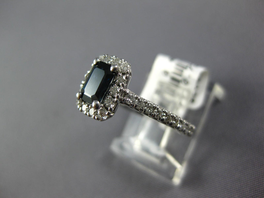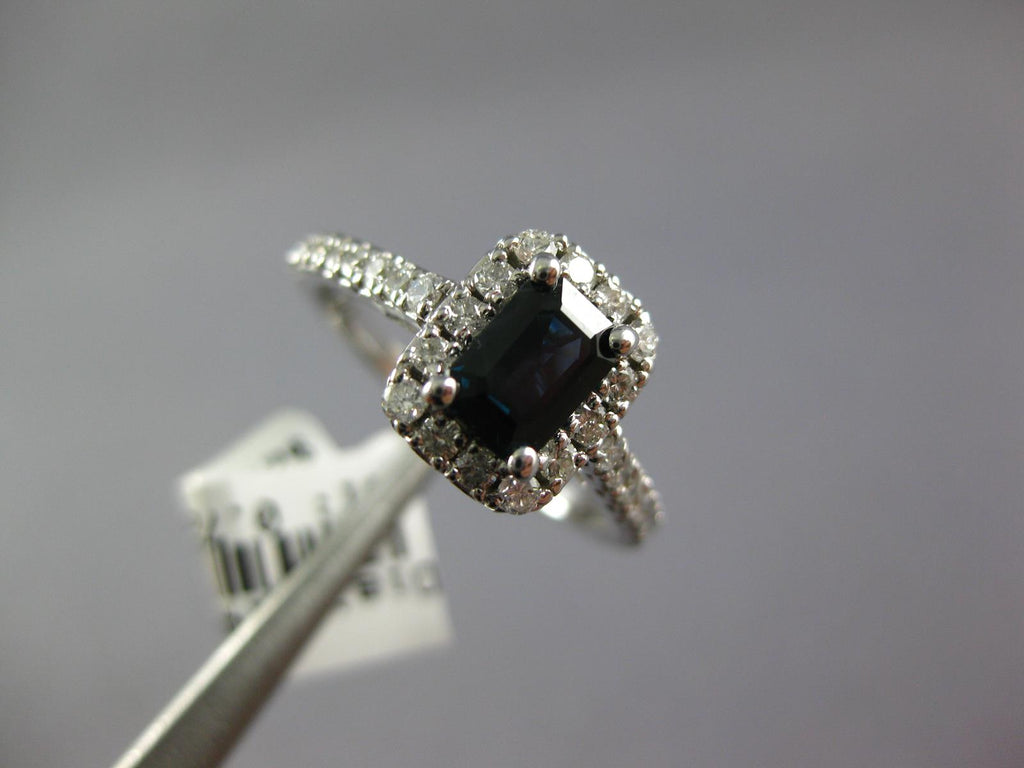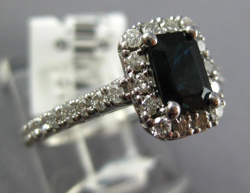 14KT WHITE GOLD ENGAGEMENT RING. 3D HALO DESIGN. ROUND DIAMONDS ARE F/G COLOR, VSSI CLARITY .49 CARATS. AAA EMERALD CUT SAPPHIRE IS .72 CARATS. MEASURES 9.5mm WIDE. RING SIZE 6.25. CAN BE SIZED BY OUR MASTER JEWELER UPON REQUEST. WRITTEN APPRAISAL AVAILABLE. COMES IN A PRESENTABLE GIFT BOX.