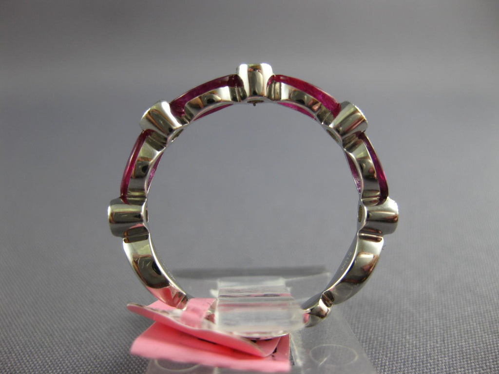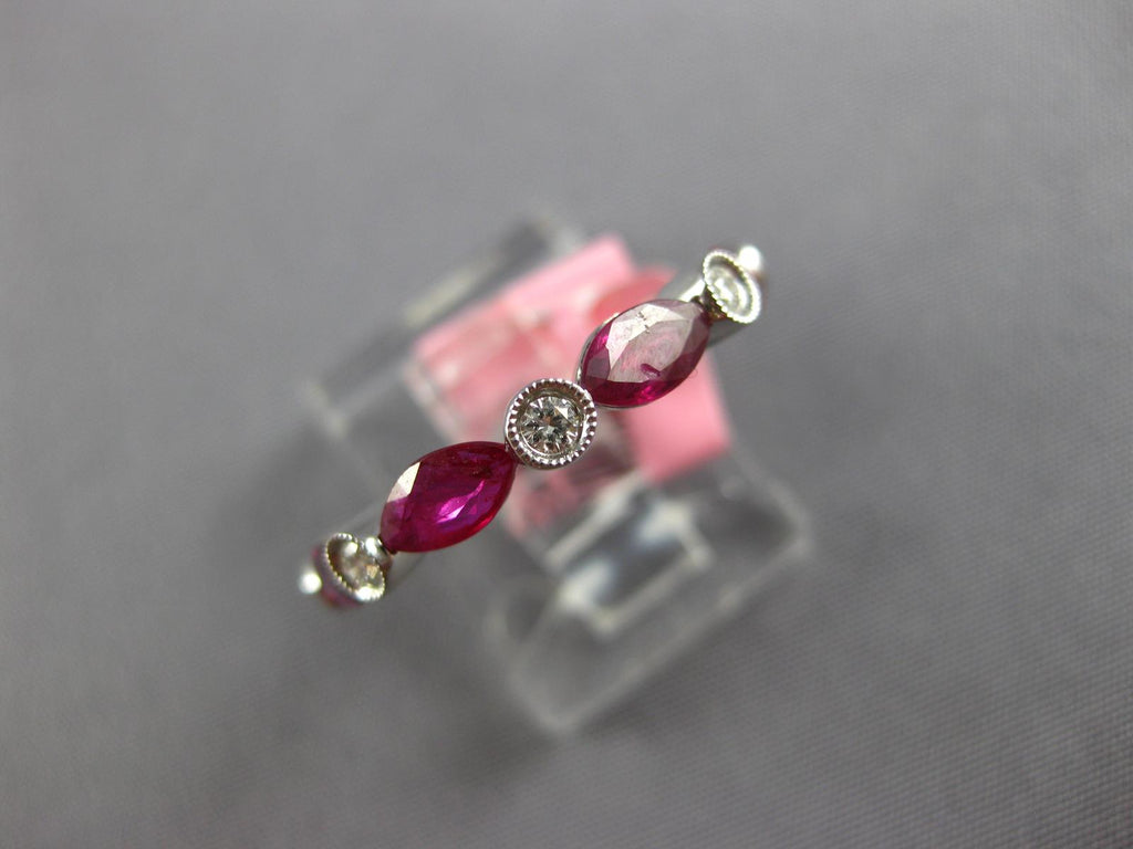 18KT WHITE GOLD FUN RING. 3D FILIGREE MILGRAIN SEMI ETERNITY DESIGN. ROUND DIAMONDS ARE F/G COLOR, VSSI CLARITY .13 CARATS. AAA MARQUISE RUBIES ARE 1.09 CARATS. MEASURES 3mm WIDE. RING SIZE 6.5. CAN BE SIZED BY OUR MASTER JEWELER UPON REQUEST. WRITTEN APPRAISAL AVAILABLE. COMES IN A PRESENTABLE GIFT BOX.