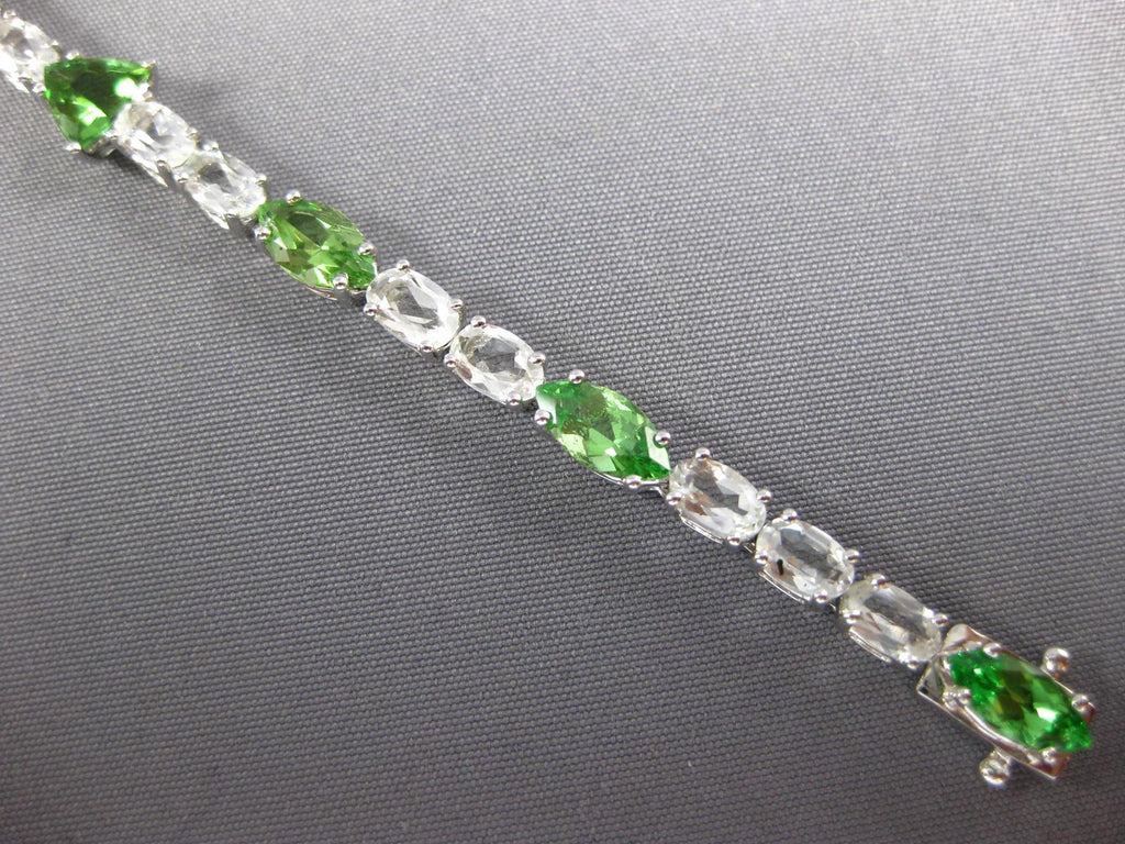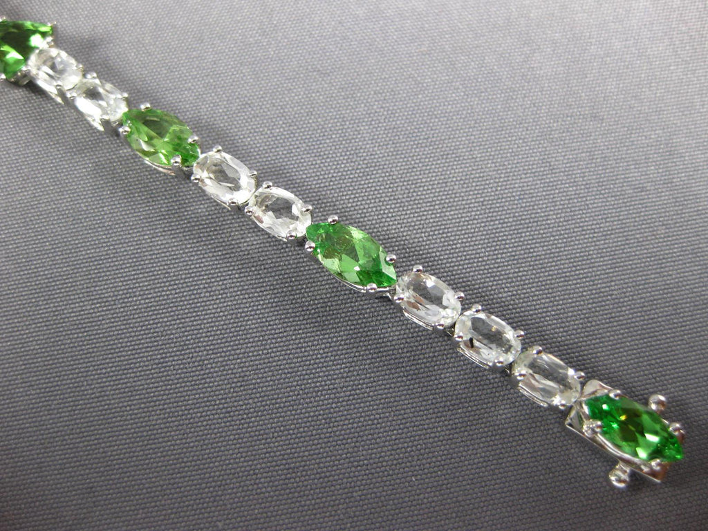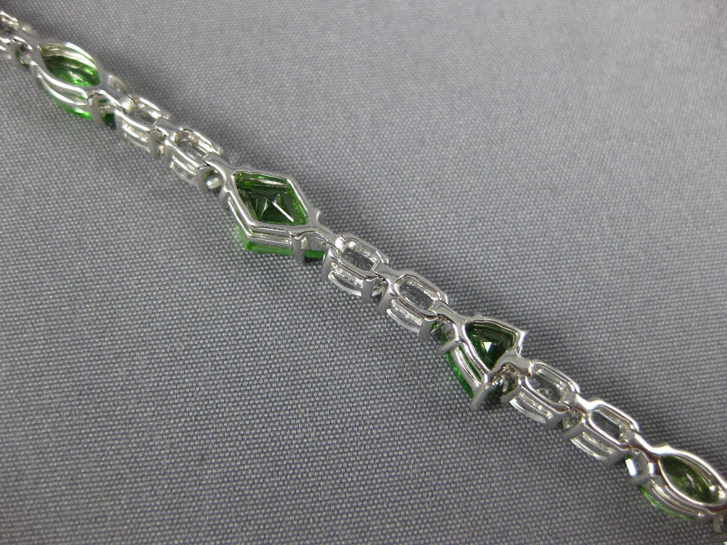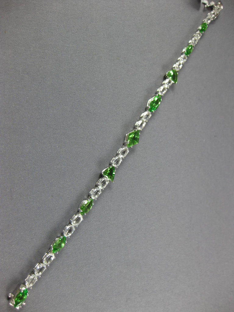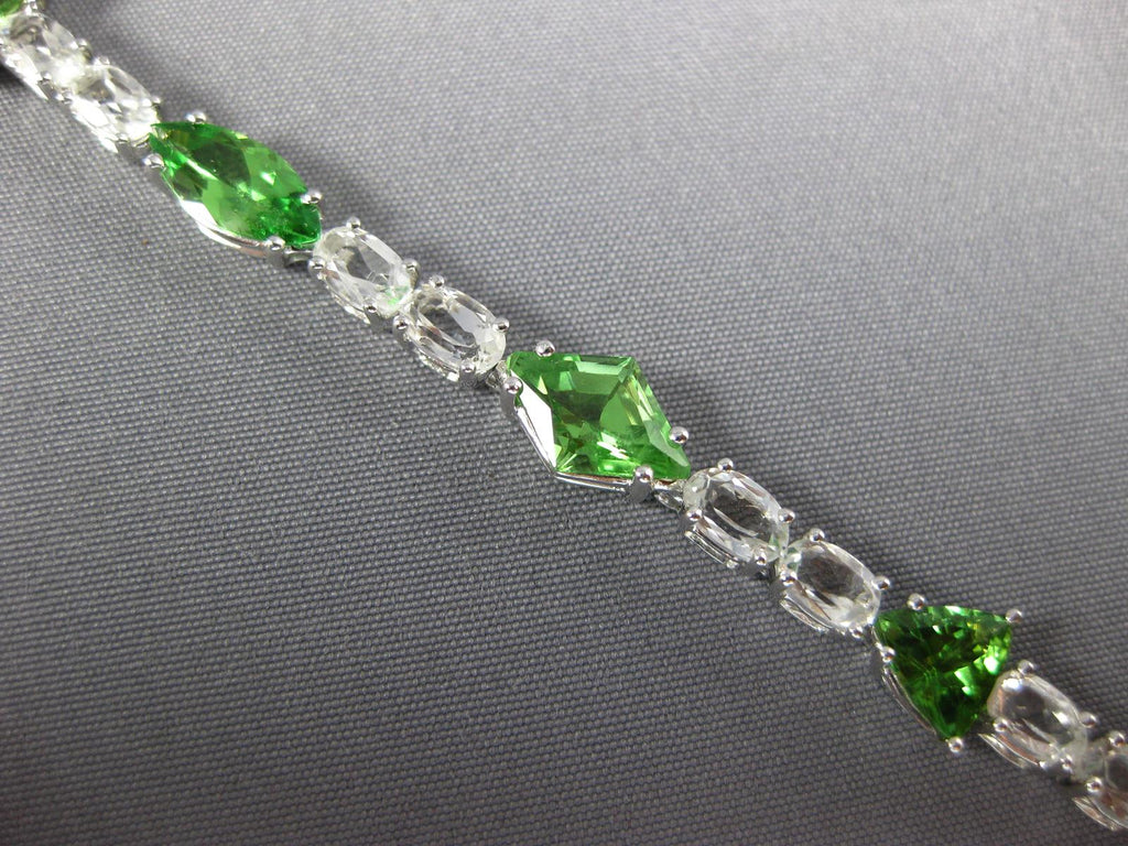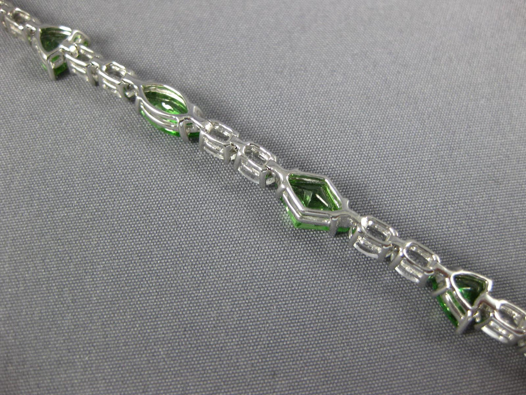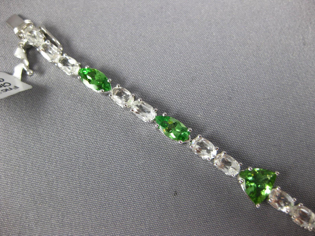 18KT WHITE GOLD FUN TENNIS BRACELET. 3D MULTI SHAPE DESIGN. AAA MARQUISE, TRILLION, AND KITE CUT TSAVORITES ARE 6.26 CARATS. AAA EXTRA FACETED OVAL WHITE SAPPHIRES ARE 6.17 CARATS. MEASURES 5mm WIDE. 7" INCHES LONG. WRITTEN APPRAISAL AVAILABLE. COMES IN A PRESENTABLE GIFT BOX.