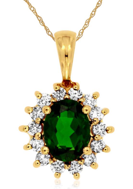 14KT YELLOW GOLD PENDANT. 3D FLOWER DESIGN. ROUND DIAMONDS ARE F/G COLOR, VSSI CLARITY .30 CARATS. AAA EXTRA FACETED OVAL RUSSALITE IS .95 CARATS. COMES ON A 14KT GOLD DIAMOND CUT 18" INCH CHAIN. WRITTEN APPRAISAL AVAILABLE. COMES IN A PRESENTABLE GIFT BOX.