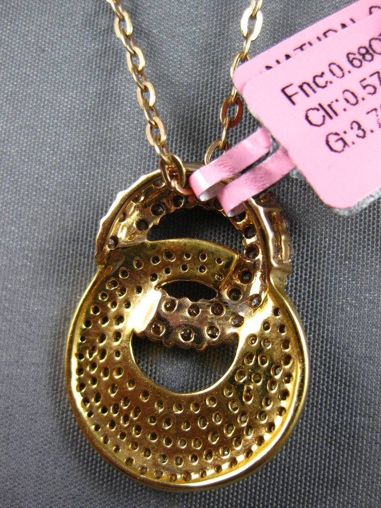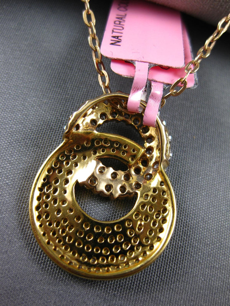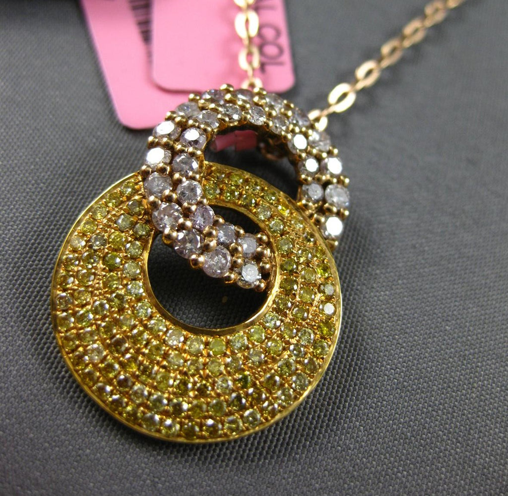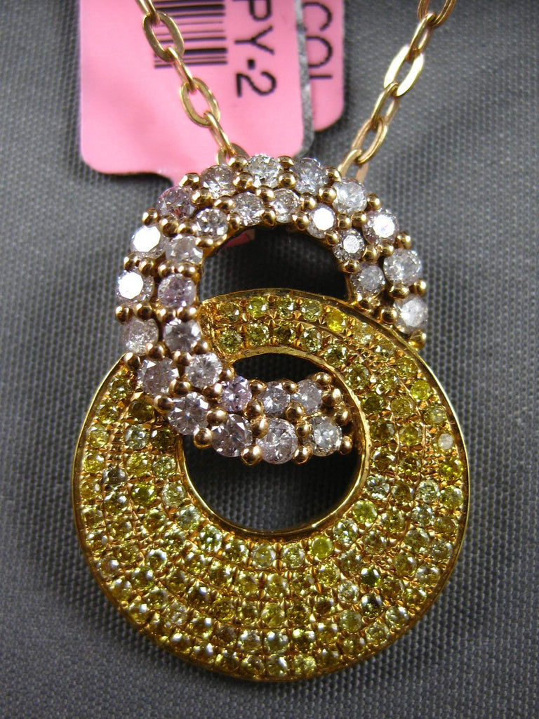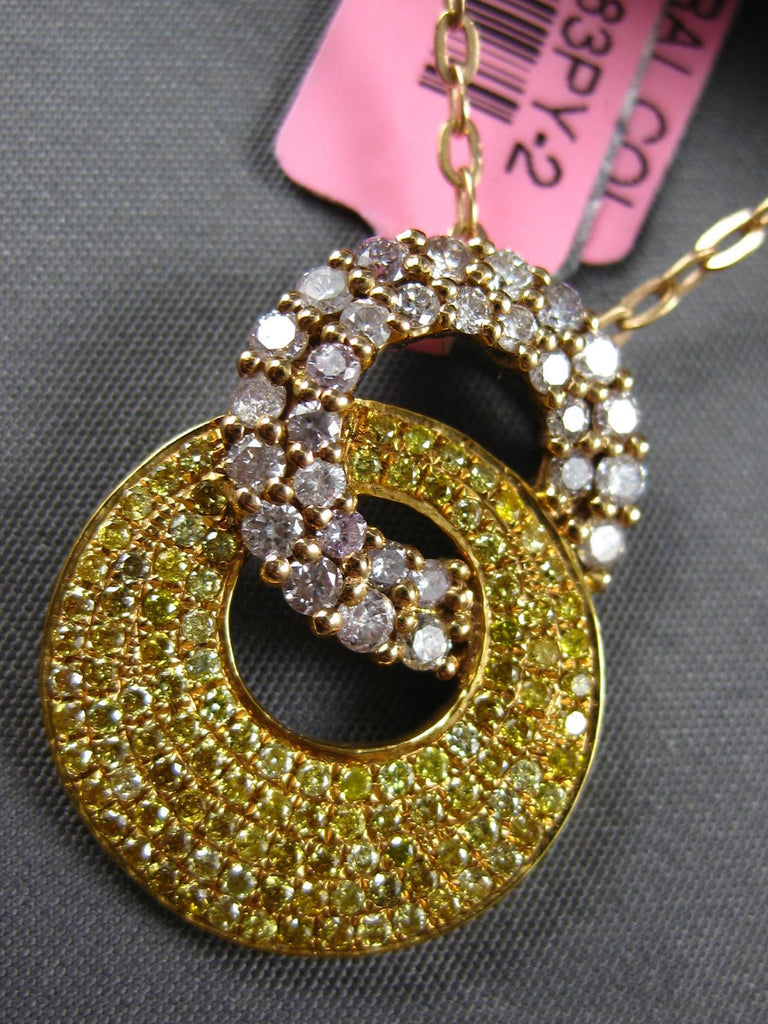 18KT YELLOW GOLD FLOATING PENDANT. 3D DOUBLE CIRCULAR LOVE KNOT DESIGN. FANCY YELLOW DIAMONDS ARE .57 CARATS. PINK DIAMONDS ARE .68 CARATS. MEASURES 24mm X 17.5mm. COMES ON A 14KT GOLD DIAMOND CUT 16" INCH CHAIN. WRITTEN APPRAISAL AVAILABLE. COMES IN A PRESENTABLE GIFT BOX.