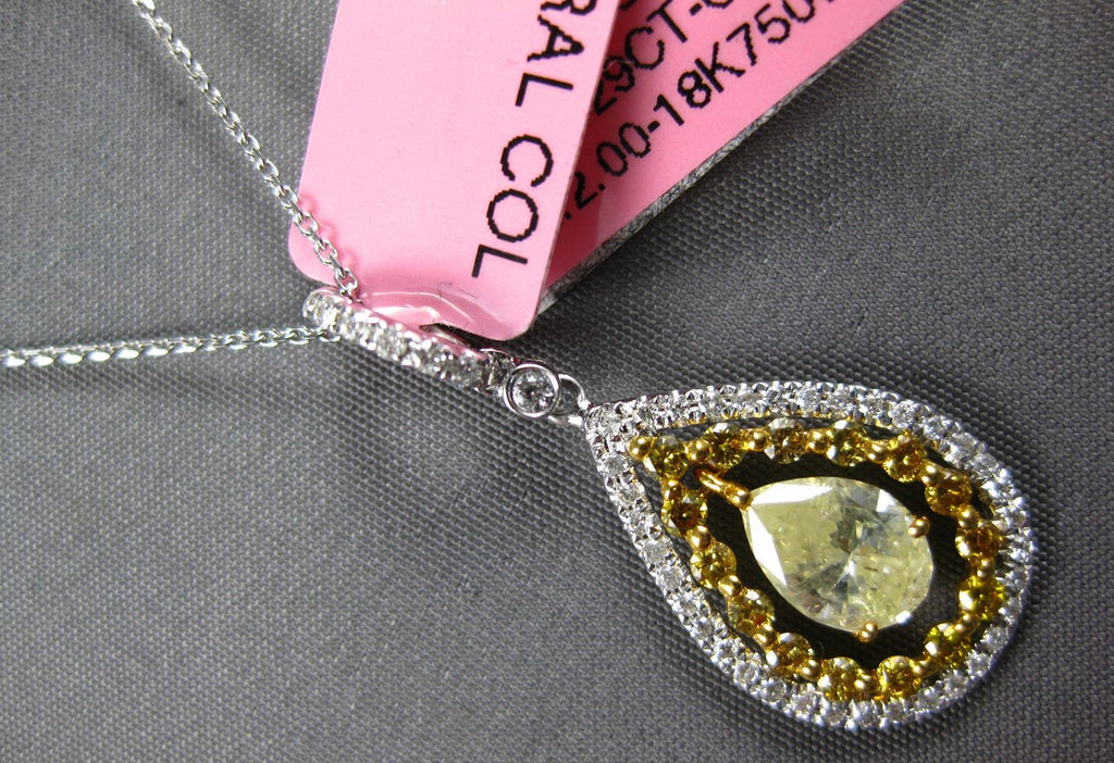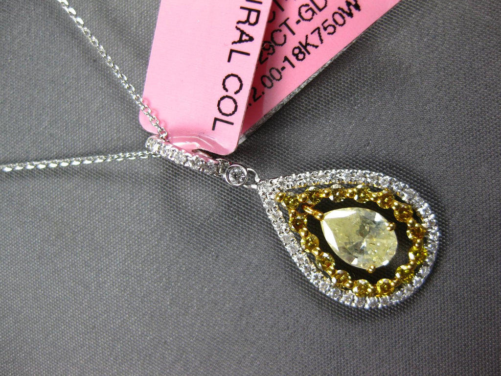 18KT WHITE GOLD FUN FLOATING PENDANT. 3D SOLITAIRE DOUBLE HALO TEAR DROP DESIGN. WHITE DIAMONDS ARE F/G COLOR, VS CLARITY .20 CARATS. CENTER FANCY YELLOW DIAMOND IS SI CLARITY AND .76 CARATS. SIDE FANCY YELLOW DIAMONDS ARE .29 CARATS. MEASURES 29mm X 12.5mm. COMES ON A 14KT GOLD DIAMOND CUT 16" INCH CHAIN. WRITTEN APPRAISAL AVAILABLE. COMES IN A PRESENTABLE GIFT BOX.