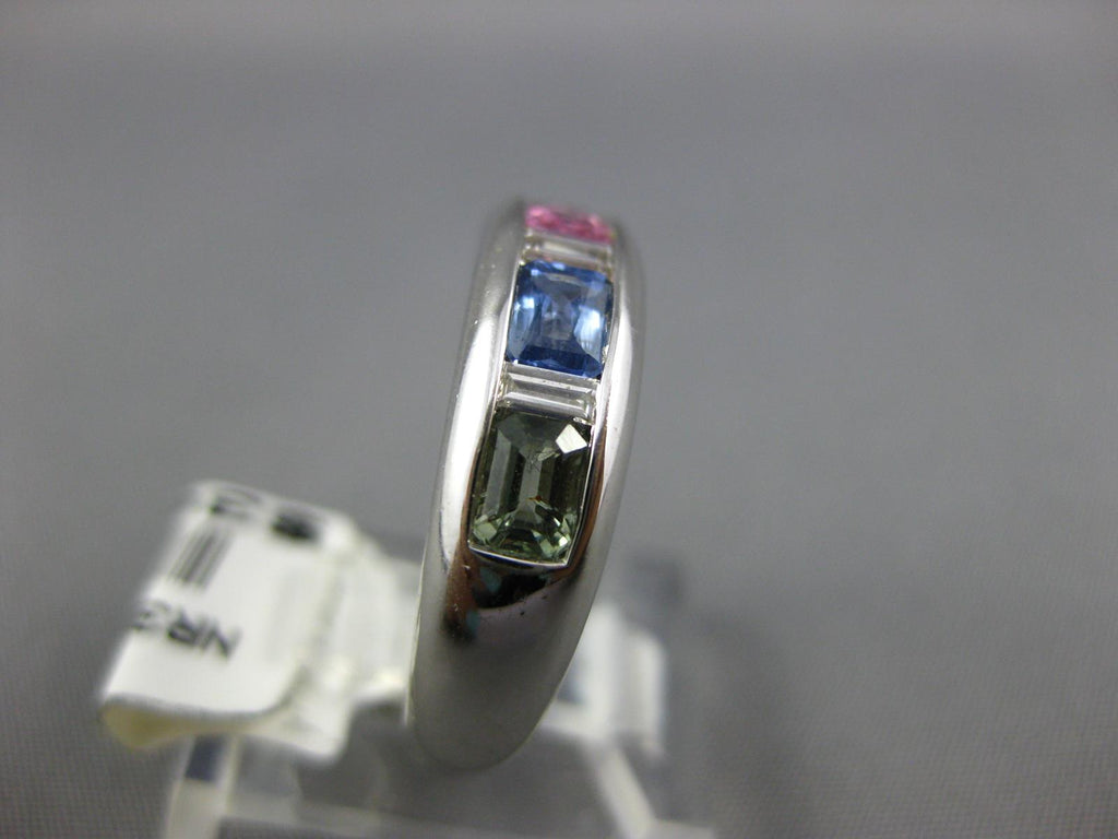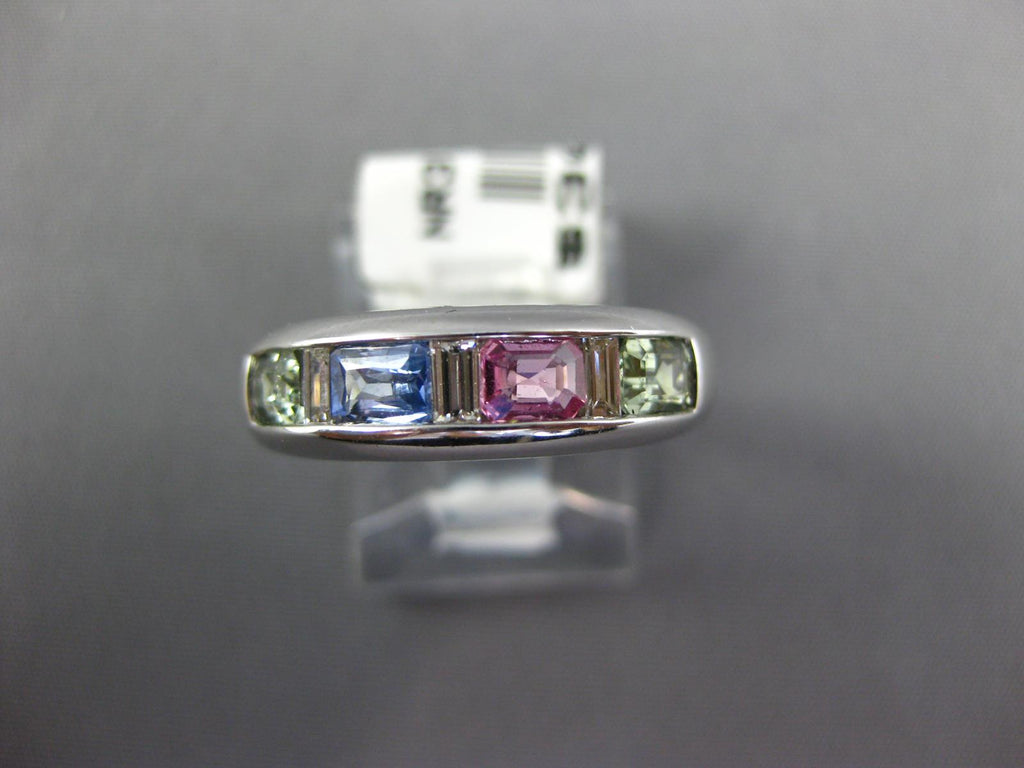14KT WHITE GOLD FUN ANNIVERSARY RING. 3D CHANNEL DESIGN. DIAMONDS ARE F/G COLOR, VSSI CLARITY .20 CARATS. AAA BAGUETTE AND EMERALD CUT MULTI COLOR SAPPHIRES ARE 1.06 CARATS. MEASURES 6mm WIDE. RING SIZE 7. CAN BE SIZED BY OUR MASTER JEWELER UPON REQUEST. WRITTEN APPRAISAL AVAILABLE. COMES IN A PRESENTABLE GIFT BOX.