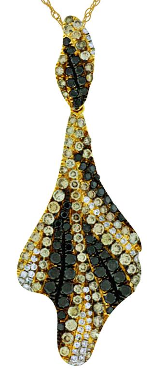 14KT YELLOW GOLD FUN FLOATING PENDANT. 3D MULTI LEAF DESIGN. WHITE DIAMONDS ARE F/G COLOR, VSSI CLARITY .10 CARATS. MOCHA DIAMONDS ARE .70 CARATS. BLACK DIAMONDS ARE .48 CARATS. COMES ON A 14KT GOLD DIAMOND CUT 18" INCH CHAIN. WRITTEN APPRAISAL AVAILABLE. COMES IN A PRESENTABLE GIFT BOX.
