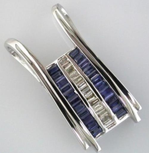 14KT WHITE GOLD FLOATING PENDANT. 3D CHANNEL DESIGN. BAGUETTE DIAMONDS ARE F/G COLOR, VSSI CLARITY .30 CARATS. AAA BAGUETTE SAPPHIRES ARE .90 CARATS. COMES ON A 14KT GOLD DIAMOND CUT 16" INCH CHAIN. WRITTEN APPRAISAL AVAILABLE. COMES IN A PRESENTABLE GIFT BOX.