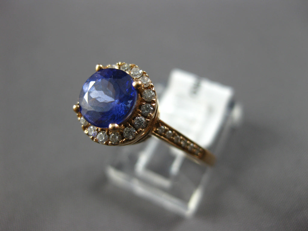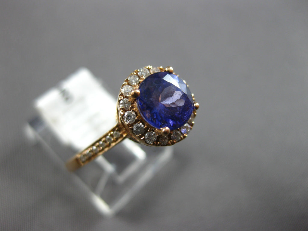 14KT ROSE GOLD ENGAGEMENT RING. 3D HALO FILIGREE DESIGN. DIAMONDS ARE F/G COLOR, VSSI CLARITY .30 CARATS. AAA ROUND TANZANITE IS 1.0 CARAT. MEASURES 9.5mm WIDE. RING SIZE 6. CAN BE SIZED BY OUR MASTER JEWELER UPON REQUEST. WRITTEN APPRAISAL AVAILABLE. COMES IN A PRESENTABLE GIFT BOX.