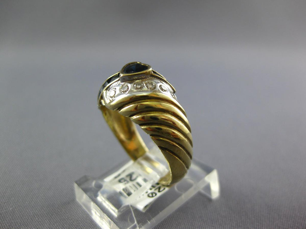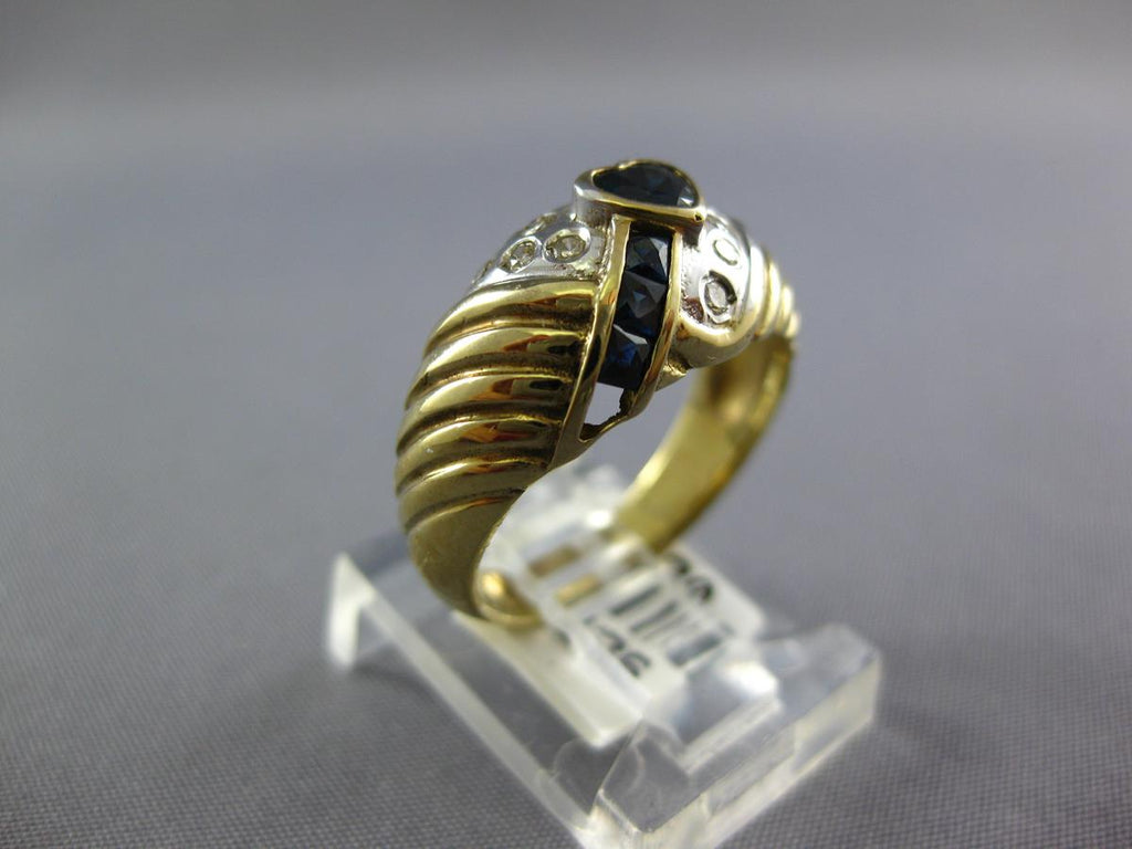 14KT YELLOW GOLD LOVE RING. 3D HEART DESIGN. ROUND DIAMONDS ARE F/G COLOR VSSI CLARITY .18 CARATS. AAA HEART SHAPE AND PRINCESS CUT SAPPHIRES ARE 1.13 CARATS. MEASURES 9mm WIDE. RING SIZE 5.75. CAN BE SIZED BY OUR MASTER JEWELER UPON REQUEST. WRITTEN APPRAISAL AVAILABLE. COMES IN A PRESENTABLE GIFT BOX.