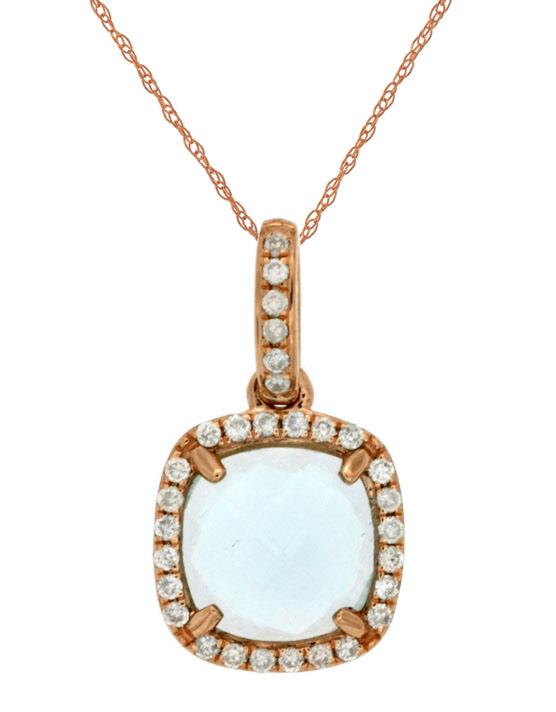 14KT ROSE GOLD FLOATING PENDANT. 3D SQUARE HALO DESIGN. ROUND DIAMONDS ARE F/G COLOR, VSSI CLARITY .12 CARATS. AAA CABOCHON SQUARE AQUAMARINE IS 1.20 CARATS. COMES ON A 14KT GOLD DIAMOND CUT 18" INCH CHAIN. WRITTEN APPRAISAL AVAILABLE. COMES IN A PRESENTABLE GIFT BOX.