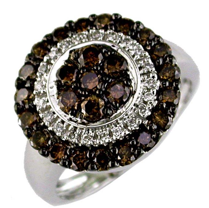 14KT WHITE GOLD LOVE RING. 3D CLUSTER FLOWER DESIGN. WHITE DIAMONDS ARE F/G COLOR, VSSI CLARITY .12 CARATS. CHOCOLATE FANCY DIAMONDS ARE 1.20 CARATS. RING SIZE 7. CAN BE SIZED BY OUR MASTER JEWELER UPON REQUEST. WRITTEN APPRAISAL AVAILABLE. COMES IN A PRESENTABLE GIFT BOX.