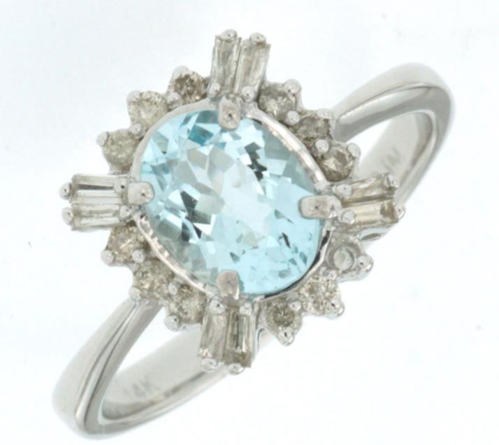 14KT WHITE GOLD FUN RING. 3D FLOWER DESIGN. ROUND AND BAGUETTE DIAMONDS ARE F/G COLOR, VSSI CLARITY .25 CARATS. AAA OVAL AQUAMARINE IS 1.10 CARATS. RING SIZE 7. CAN BE SIZED BY OUR MASTER JEWELER UPON REQUEST. WRITTEN APPRAISAL AVAILABLE. COMES IN A PRESENTABLE GIFT BOX.